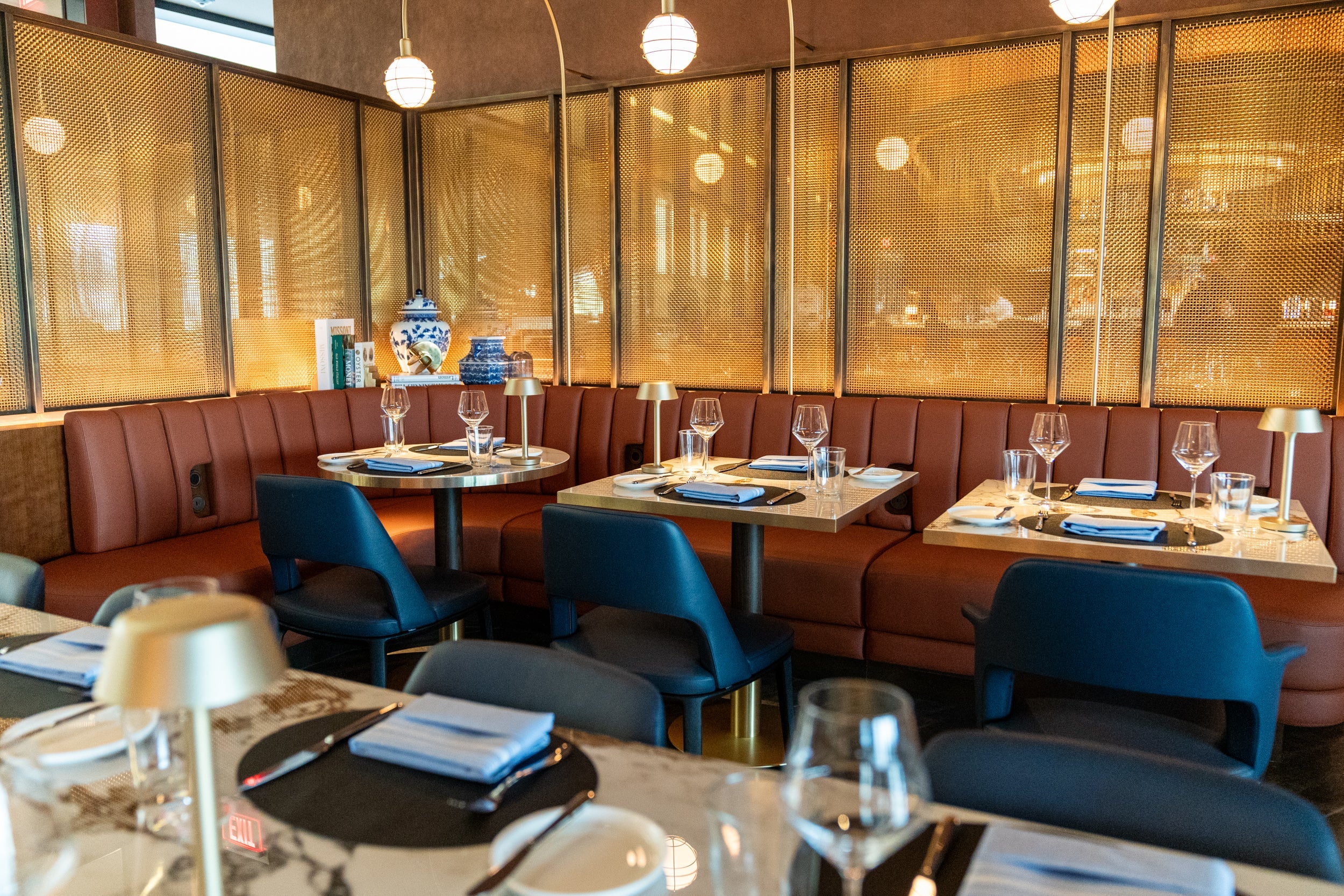Like the main lounge, the space is broadly shaped like a luxurious ship's cabin, long and slightly narrow. Other touches include brass accents throughout, including at the long, ship-shaped bar and a railing that runs along the length of the lounge.