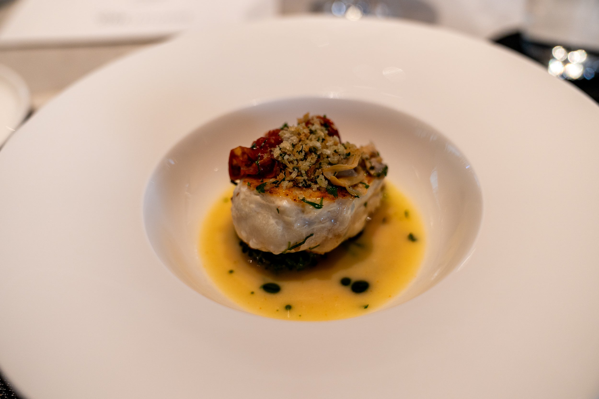 The seared fish a la plancha will be a rotating catch of the day — during the tasting, it was a Maine halibut, perfectly cooked right in front of us.