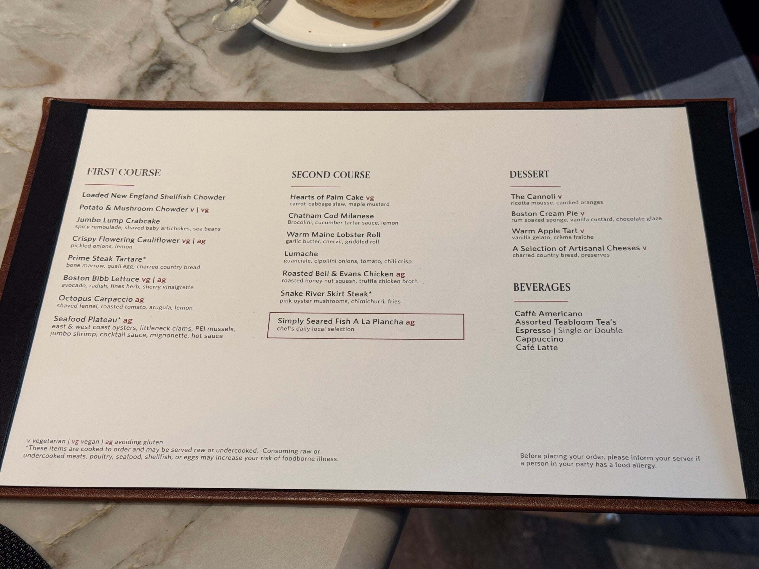 Sticking with the local flair, the menu in Boston, which was crafted by celebrated chef Ed Brown, leans toward seafood, though there are plenty of other options as well.