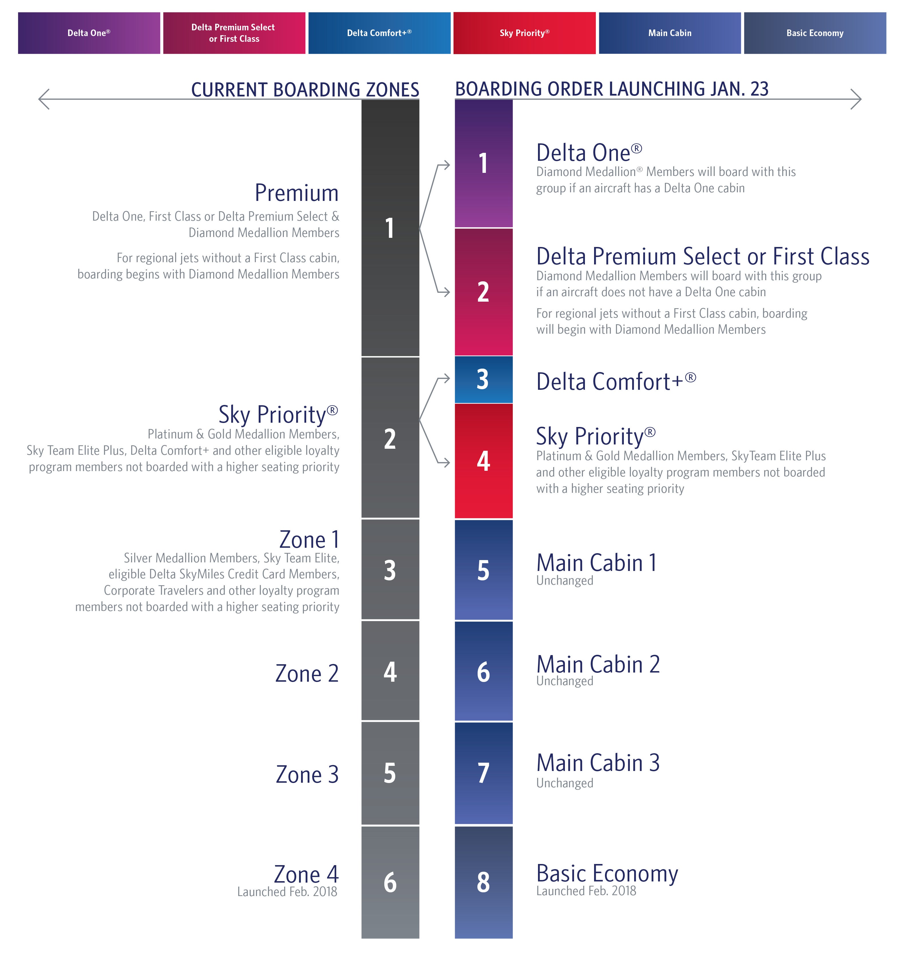 Beginning Jan. 23, 2019, the boarding order will shift again, allowing Delta One passengers to board first on planes equipped with the product and Delta Comfort+ passengers to board ahead of Platinum and Gold Medallions who happen to be seated in the Main Cabin. I also found it interesting that Delta is removing "zones" from the parlance surrounding the boarding process. It's likely a move to humanize what is by its very nature a wild and chaotic experience, calling people up based on the product they purchased versus the confinement area they're relegated to. Subtle, but meaningful from a language and emotion standpoint.