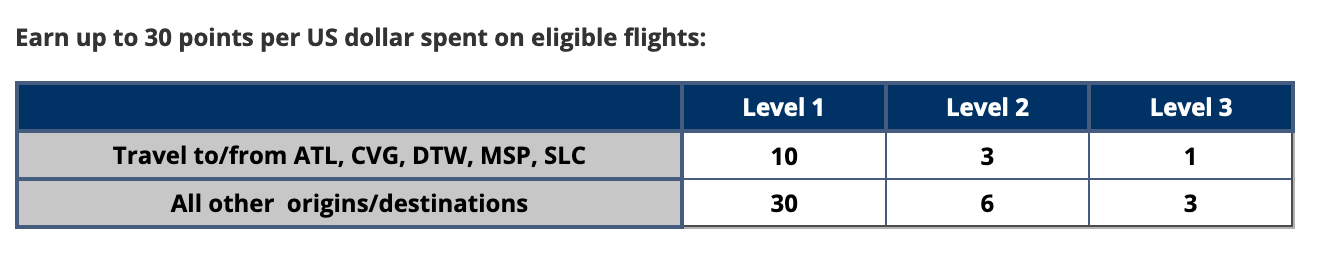 If you have employees that frequently travel to and from non-hub cities, you're in luck. You can earn up to 30 points per dollar spent on those tickets. If most of your travel (or your employees' travel) starts or ends in a Delta hub the earnings are much lower. Additional levels fold in fare classes and different carriers that Delta partners with.