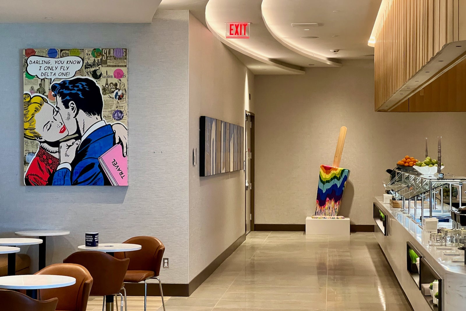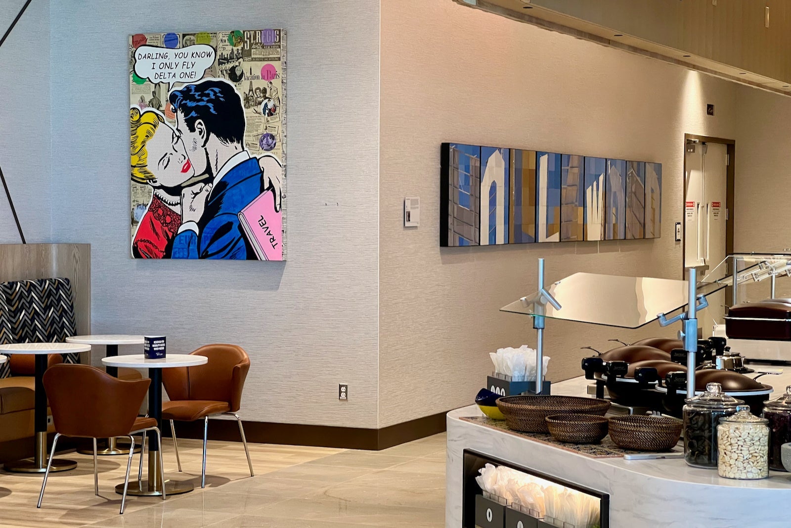 All of the pieces combine to give the lounge a unique vibe, though one, in particular, is especially appropriate: a painting by Nelson de LaNuez of a couple embracing, with the woman saying "darling, you know I only fly Delta One."