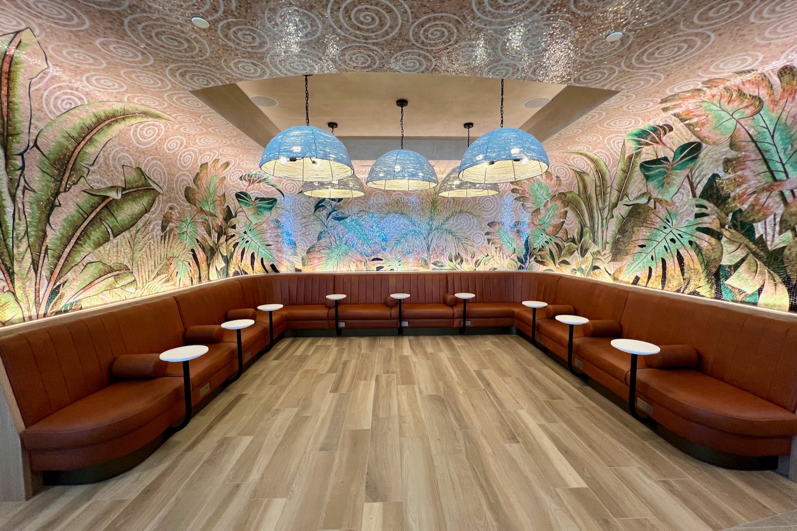 Located between the main bar and the auxiliary buffet, the grotto is a nook that pays tribute to Hollywood's golden age with an exquisite mural crafted from imported Italian tile.