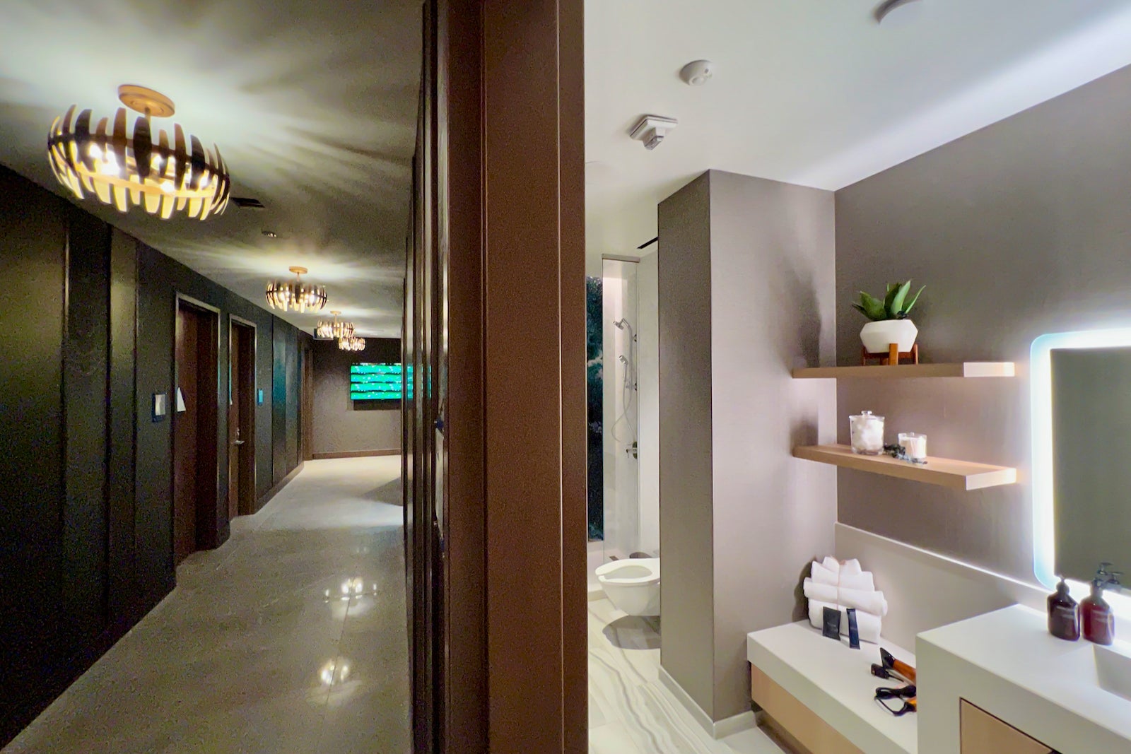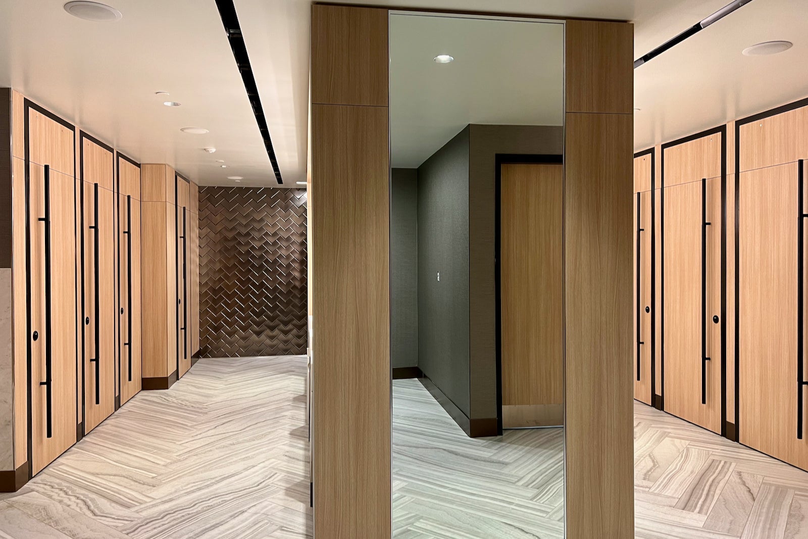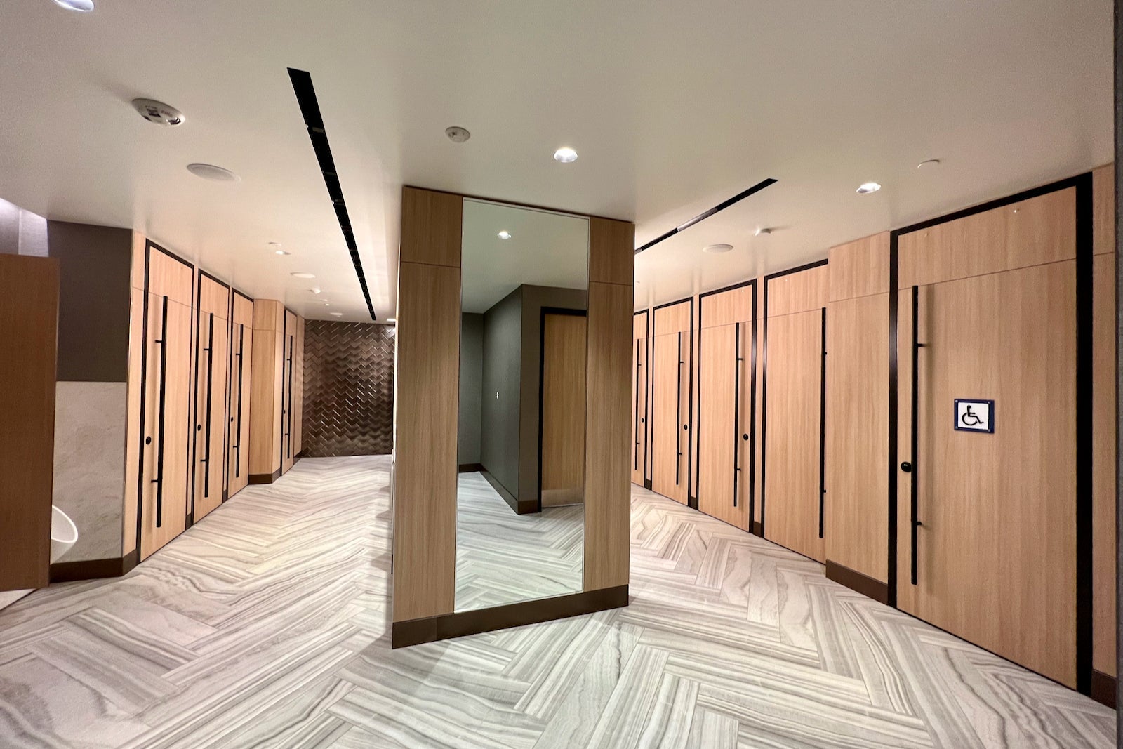 The restrooms in the Sky Club feature individual stalls with floor-to-ceiling wood panels and plenty of mirrors around the vanity area.