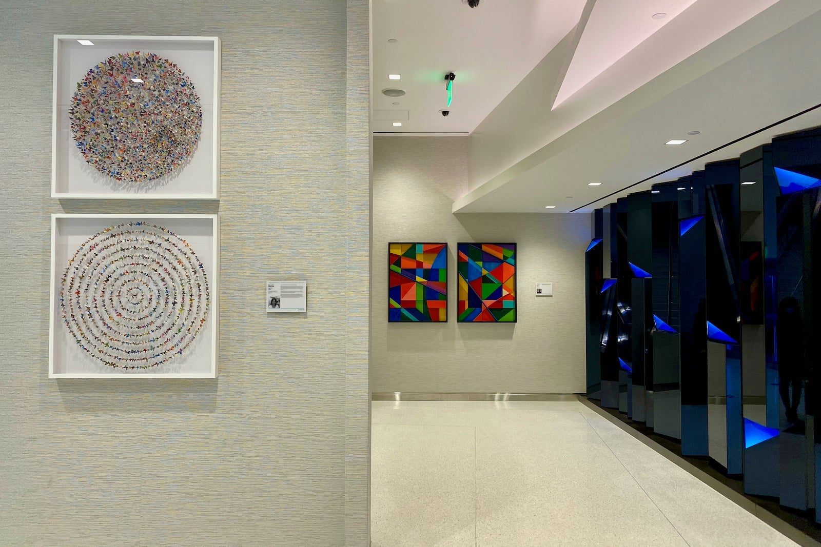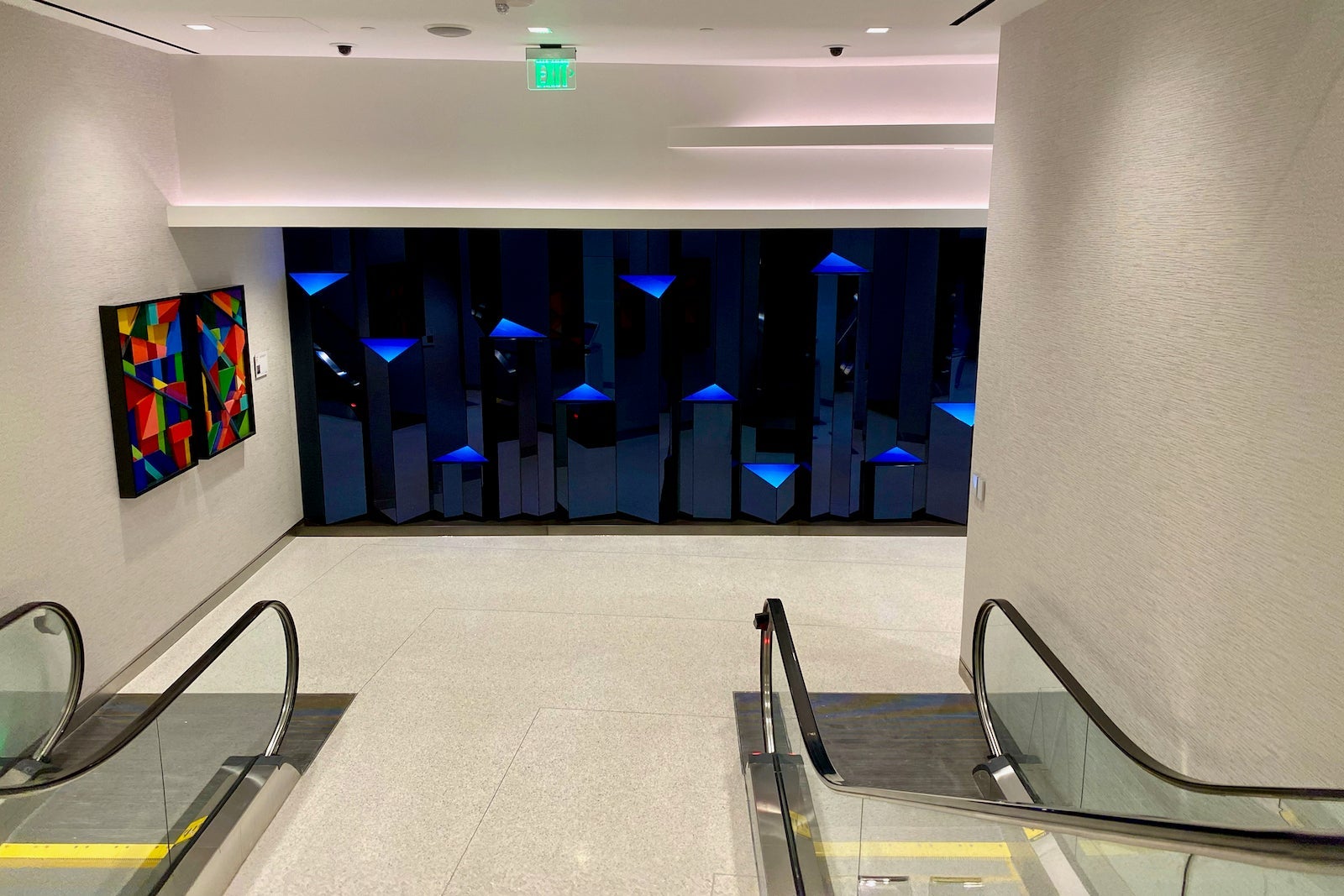 Works like the "Bluebird Mountain" that hangs near the second-floor entrance immediately create a sense of calm amidst the otherwise bustling airport.