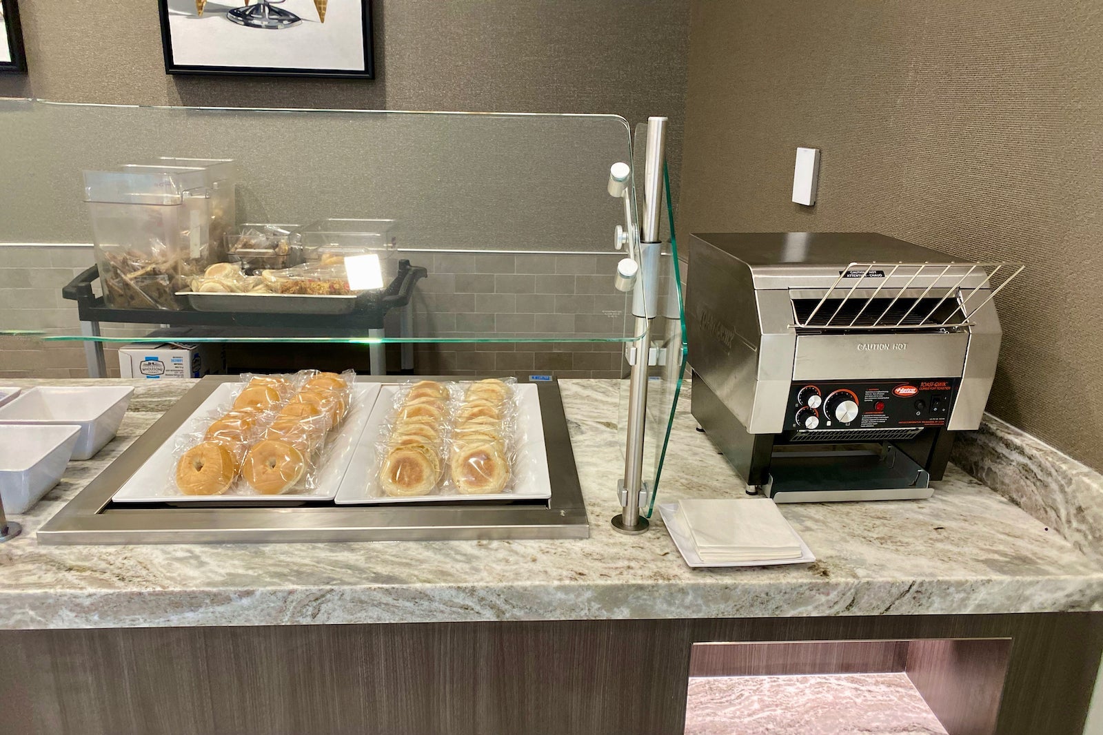 As you continue walking towards the bar, the lounge splits into two sections. To the left of the bar is the main cafe and dining area, as well as a buffet and beverage station.