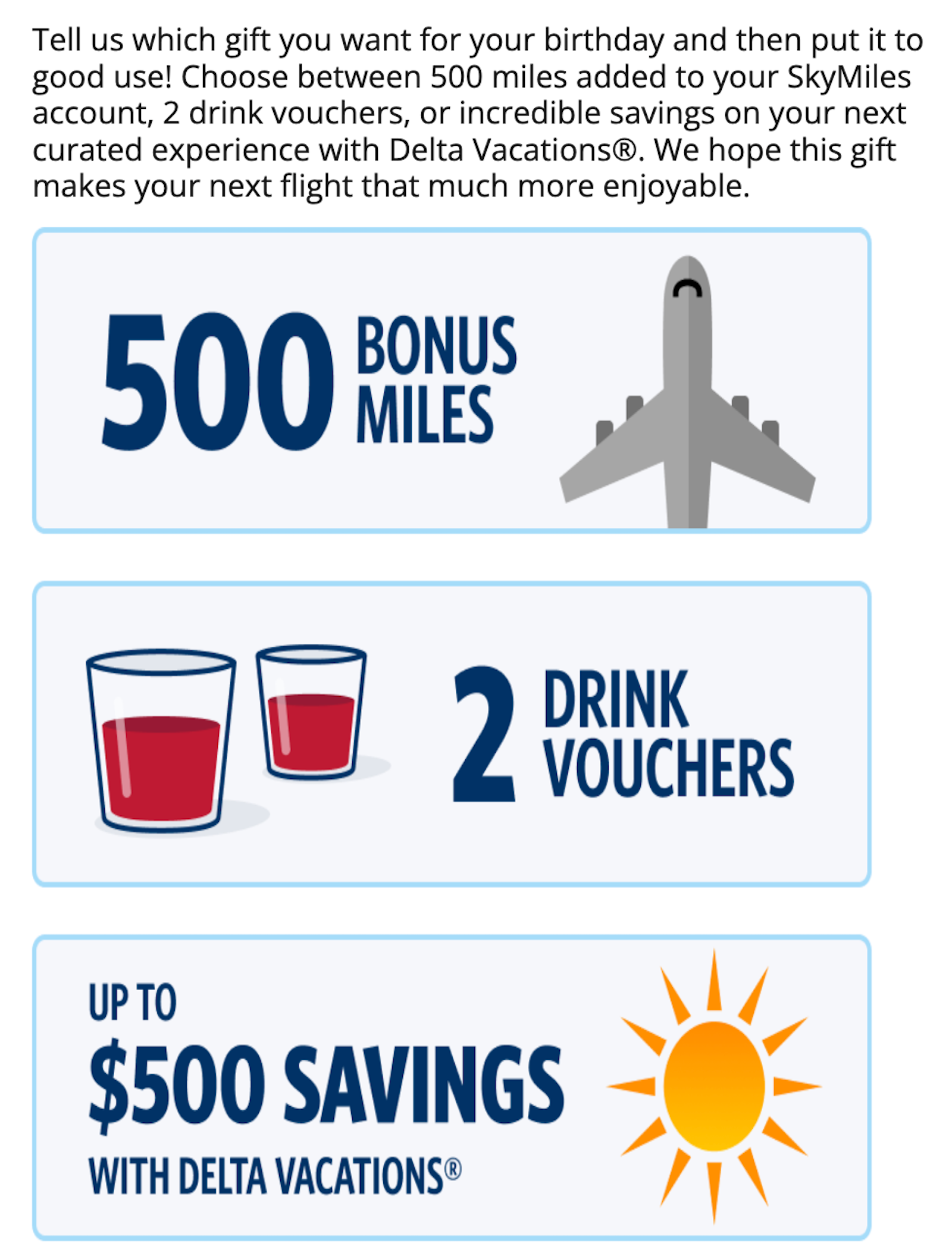 TPG executive editor Scott Mayerowitz and senior aviation reporter Ethan Klapper both reported family members received an email prompting them to select which birthday offering they would prefer. The choices are 500 bonus miles, two drink vouchers or up to $500 in savings with Delta Vacations.