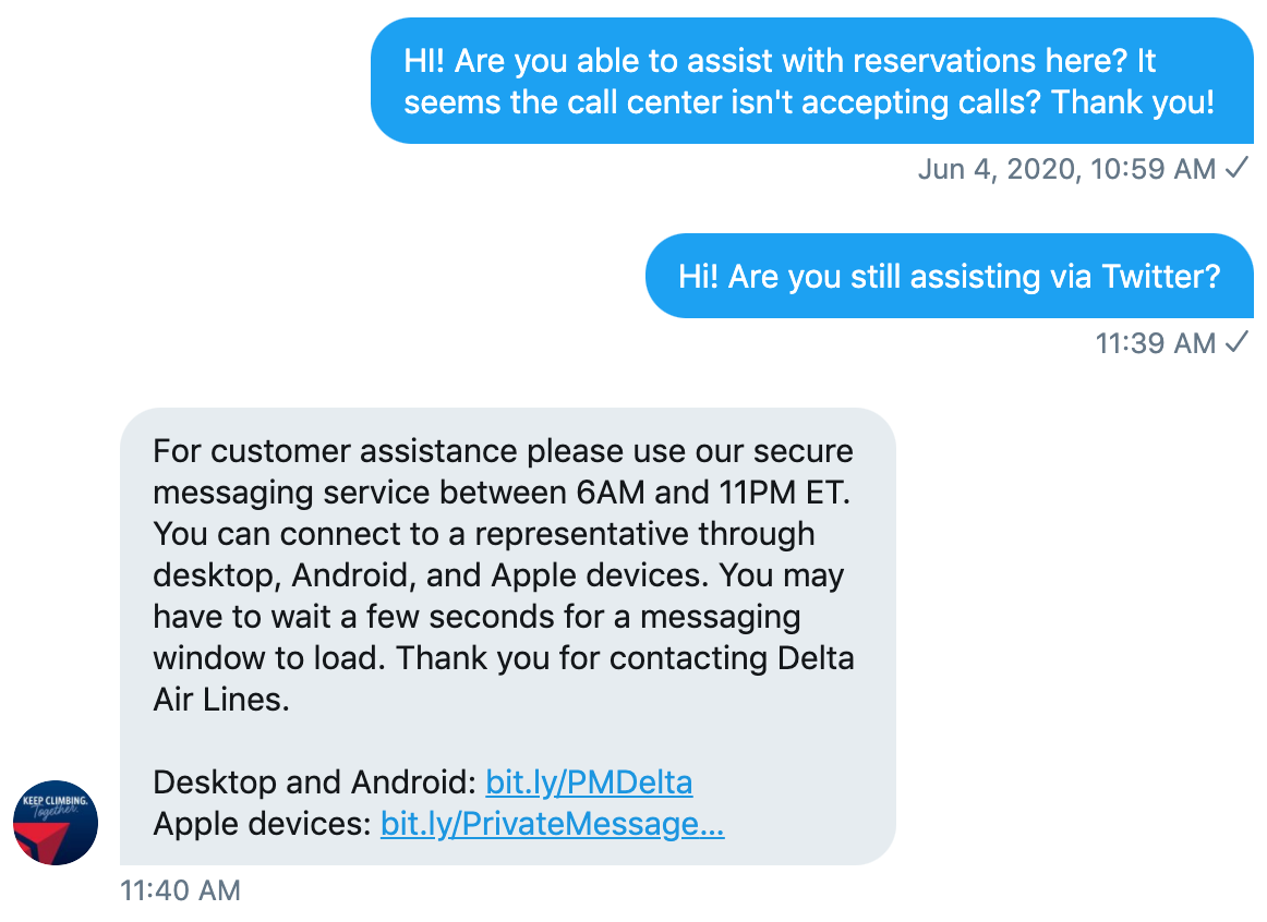 We know that many customers prefer to interact with Delta about needs for their upcoming travel through messaging. That's why we continue to offer that via the 'Message Us' feature in the Fly Delta App. Delta teams continue to actively service customer needs in this way even as private/direct messaging via Delta's Facebook and Twitter pages is temporarily paused. We appreciate our customers' understanding as we serve them during the ongoing COVID-19 pandemic.