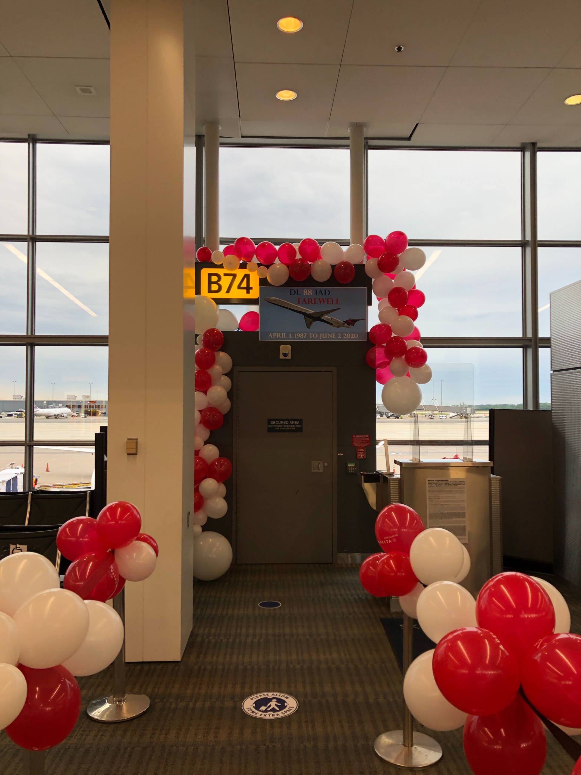 The send off at Dulles was muted compared to some past aircraft retirements. Staff decked out the gate with red-and-white balloons and signs saying "DL88 IAD Farewell." Most travelers onboard the flight appeared to be aviation aficionados, or AvGeeks.