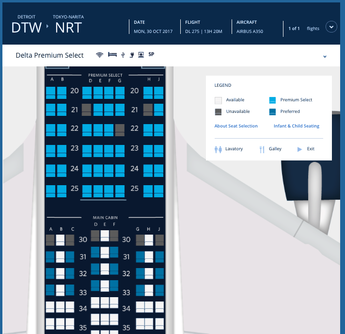 Seat maps loaded at delta.com show the A350 configuration, including 32 new Delta One suites along with the airline's new Premium Select premium economy cabin featuring 48 seats, on Delta flight 275 from Detroit (DTW) to Tokyo/Narita (NRT) at 1:40pm starting October 30. The return on October 31 is Delta flight 276 departing from Narita back to Detroit at 5:50pm Tokyo time. Delta currently has a 747-400 flying this route, which is scheduled to be operating using the same flight numbers up through the previous day.