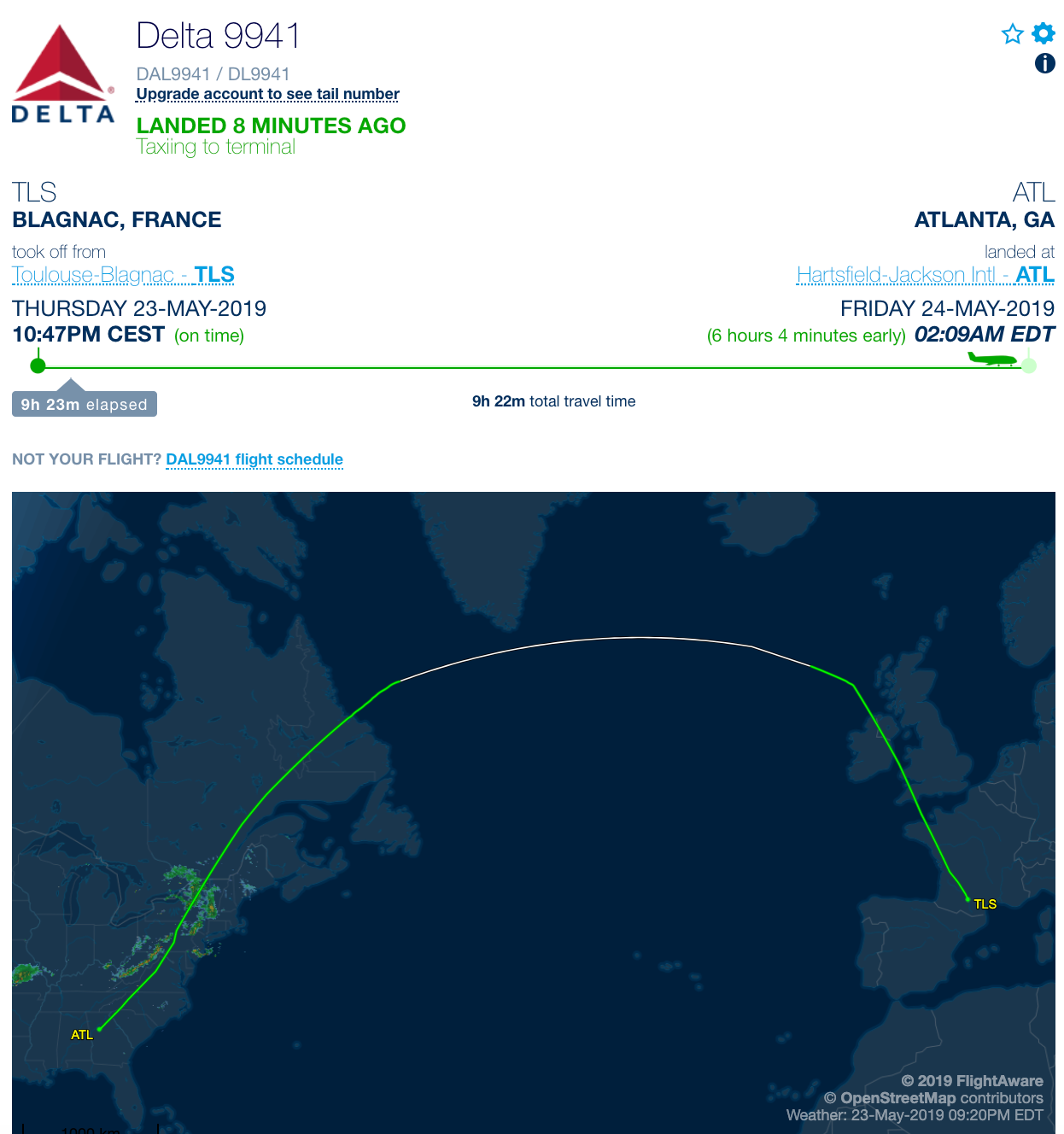 Ship 3401 crossed the Atlantic Ocean as Flight 9941, covering 4,870 miles in 9 hours and 22 minutes. With a late departure from France, it arrived in Atlanta at 2:09am on Friday (May 24). Of note, the delivery flight was made with "synthetic jet fuel," and Delta has confirmed that it's working with Airbus to "power future delivery flights with similar fuels."