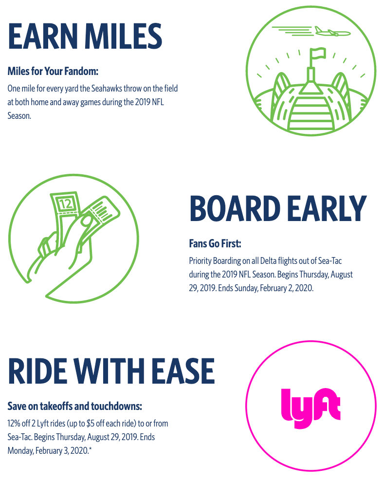 For those who choose to side with Team Delta this fall, they'll receive one mile for every Seahawks passing yard during regular and postseason games at home and on the road. Members will also receive Priority Boarding on all Delta flights from Seattle-Tacoma International Airport during the 2019 season starting now and lasting through Feb. 2, 2020.