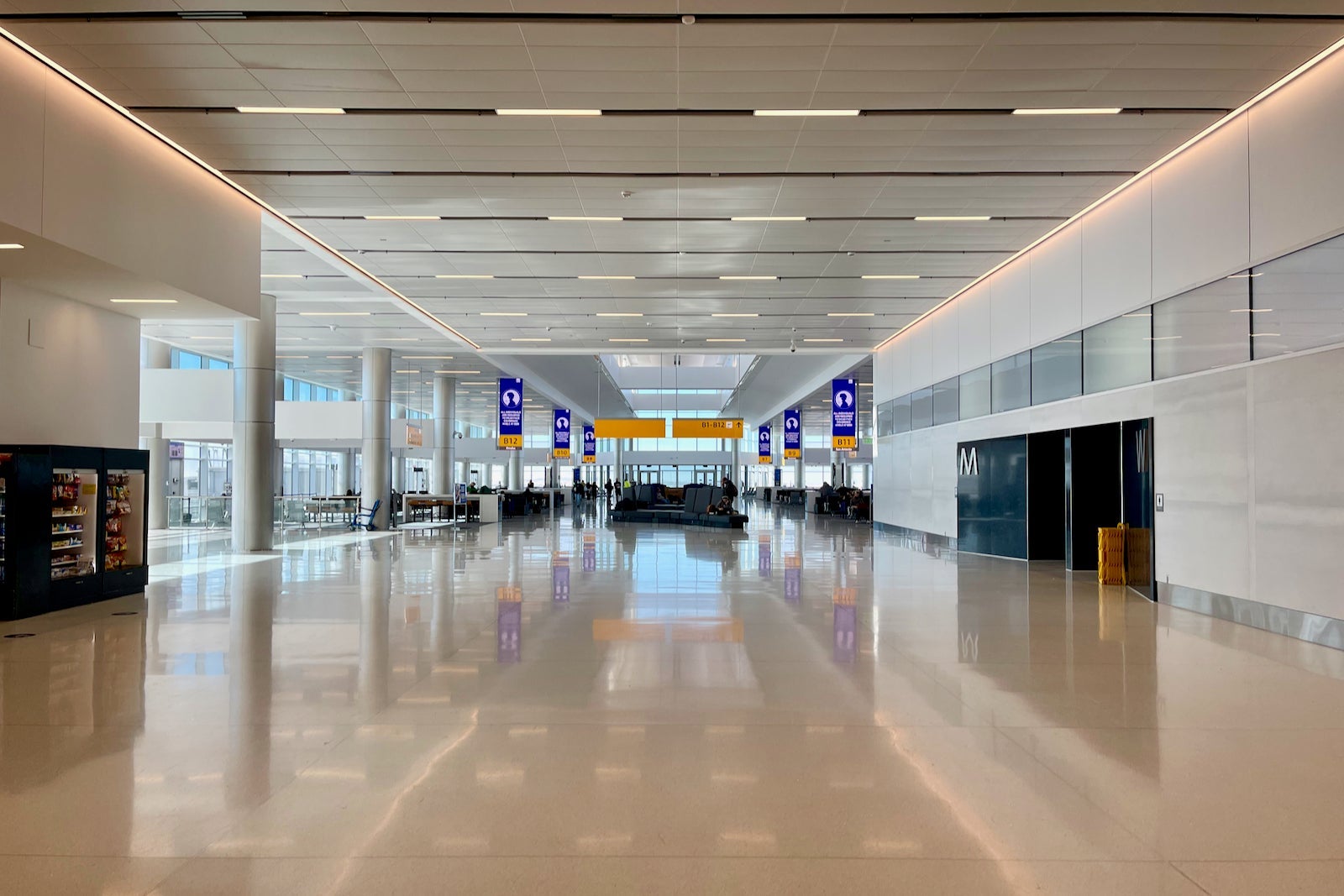 The first thing you'll notice is the sweeping floor-to-ceiling windows, allowing light to stream in from all corners of the terminal.