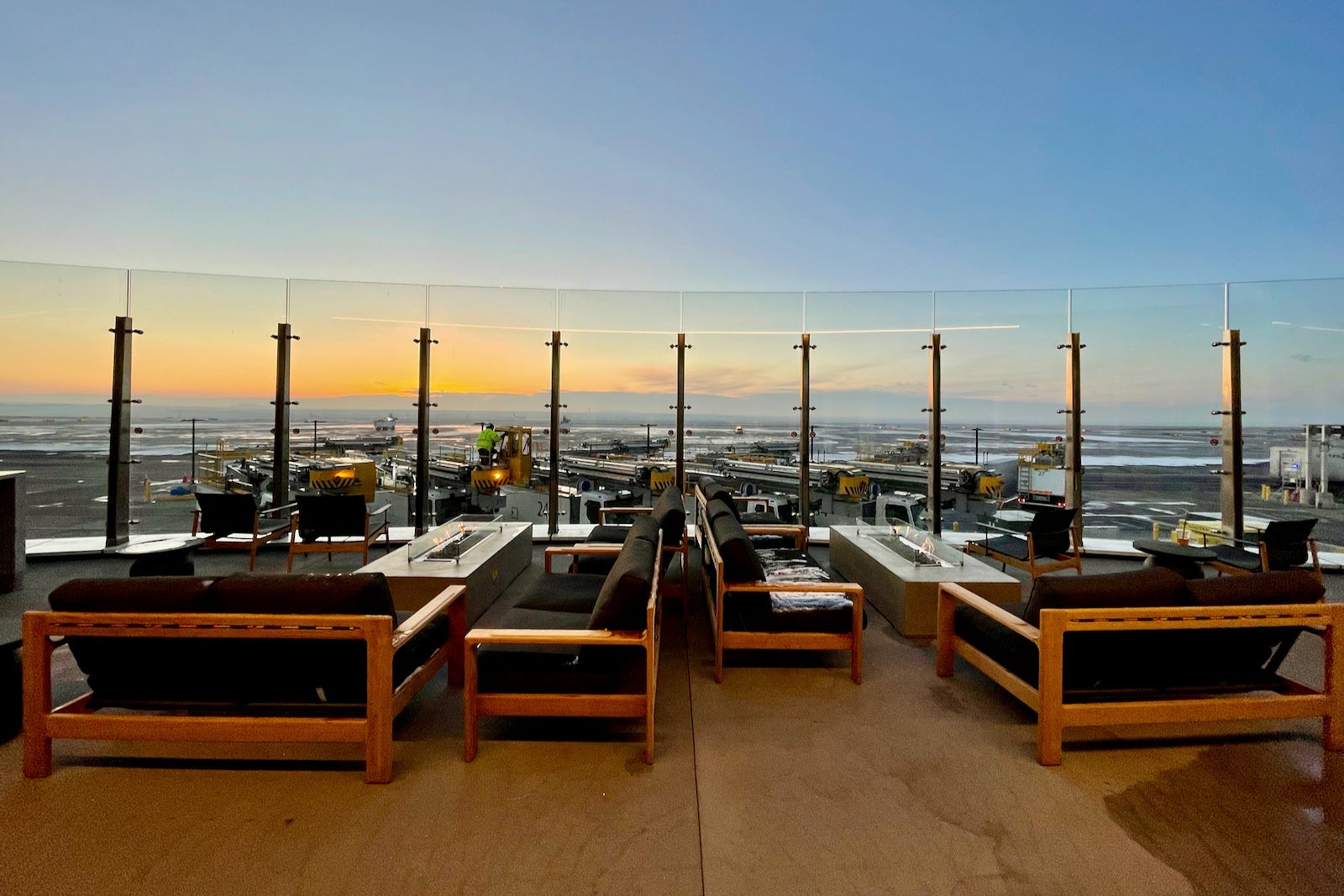 The west-facing deck sports a variety of all-weather seating, a bar area and two fireplaces. You'd be hard-pressed to find a better spot at the airport to enjoy the sunset, though the new Amex Centurion Lounge gives the deck a run for its money.