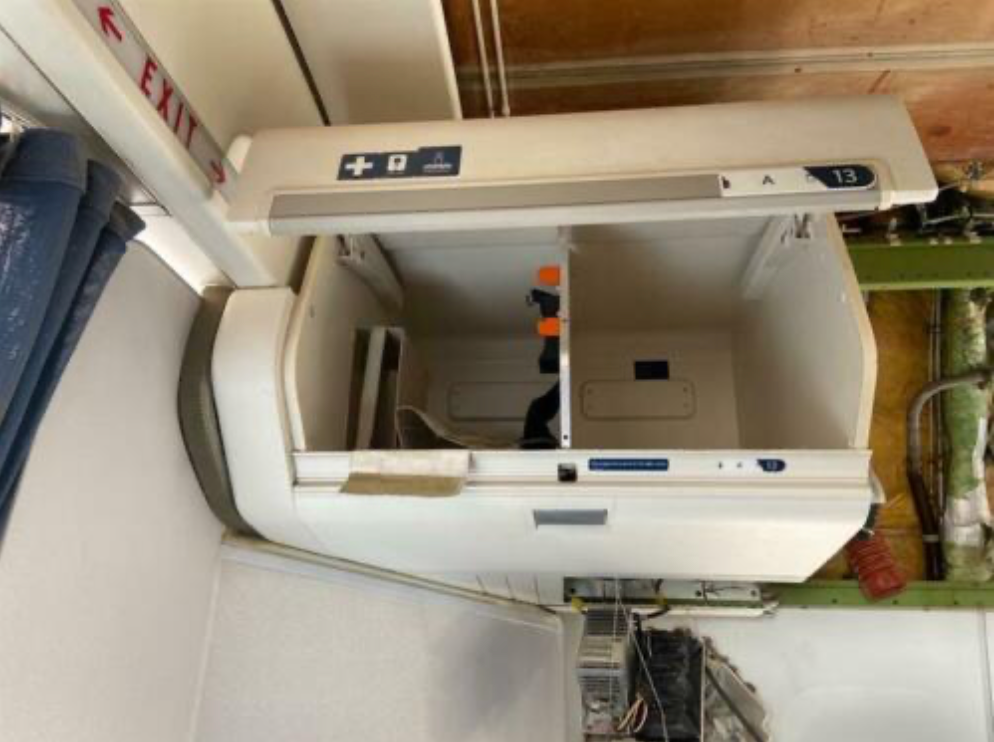 This is what flight crews would grab as they jumped down the upper deck slide to the raft. Fortunately, it hasn't been touched since December 1988, when it was first manufactured.
