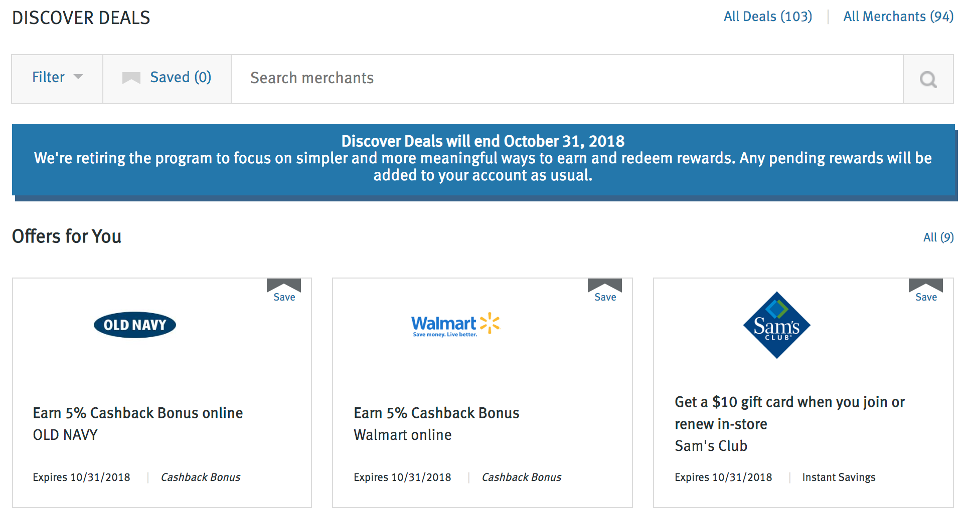Looks like price protection isn't the only Discover Card perk that's expiring on Halloween. Cardmembers who log in today to take advantage of the issuer's cash back shopping portal are greeted by the following message: "Discover Deals will end October 31, 2018. We're retiring the program to focus on simpler and more meaningful ways to earn and redeem rewards. Any pending rewards will be added to your account as usual." TPG reader Casey K. tipped us on the closure, and I've confirmed via my own Discover account.