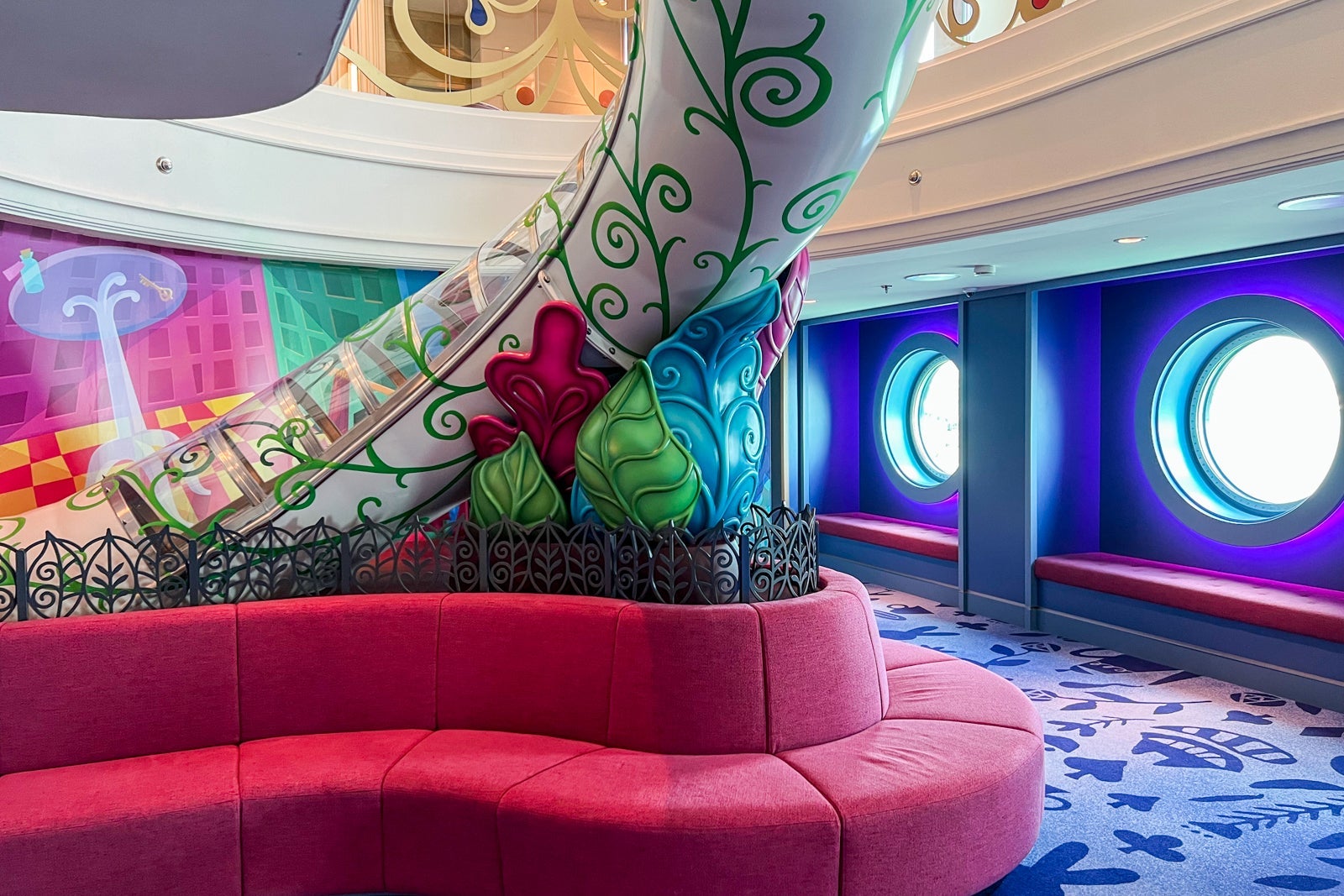 In a pure stroke of genius, Disney added a fun, unconventional way for kids to enter the Oceaneer Club. After checking into the kids club from the Grand Hall on Deck 3, children can zip down a magical slide that takes them straight into the space on Deck 2.