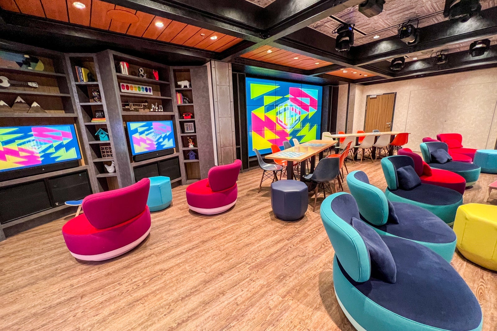 And at the teen club, Vibe, the decor draws inspiration from a Parisian loft, offering lots of spots to lounge, watch movies, meet new people and play games. Honestly, this space looked so cool, I'd want to hang out there myself.