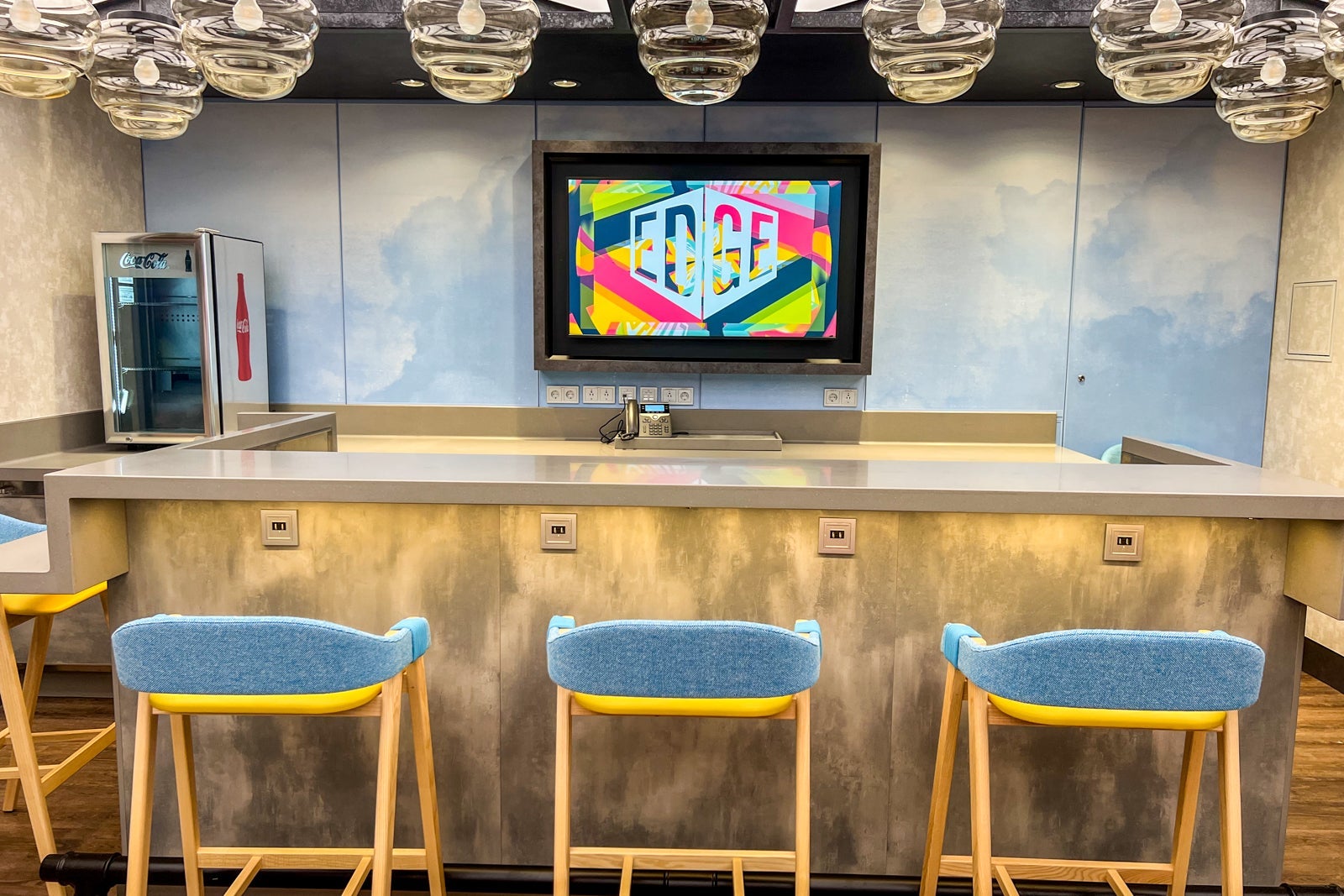 In Deck 5's tween club, Edge, kids can hang out in a New York City-inspired loft space with a faux-grass picnic area, photo walls and an entrance hidden behind a framed piece of art.