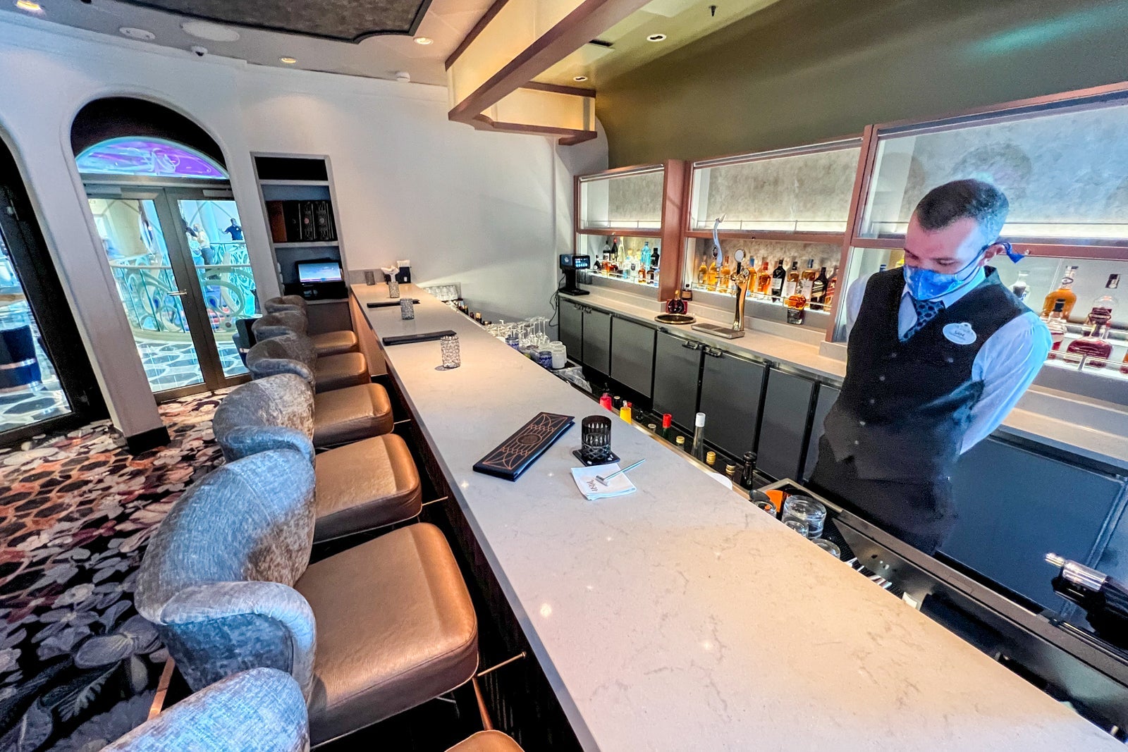 You'll enter the lounge via a room that is dark and serves as a "palate cleanser" from the rest of the ship. Then, once inside, everything from the custom furniture to the liquor bottles and specialty cocktails to the tap handles for the beer is themed accordingly.