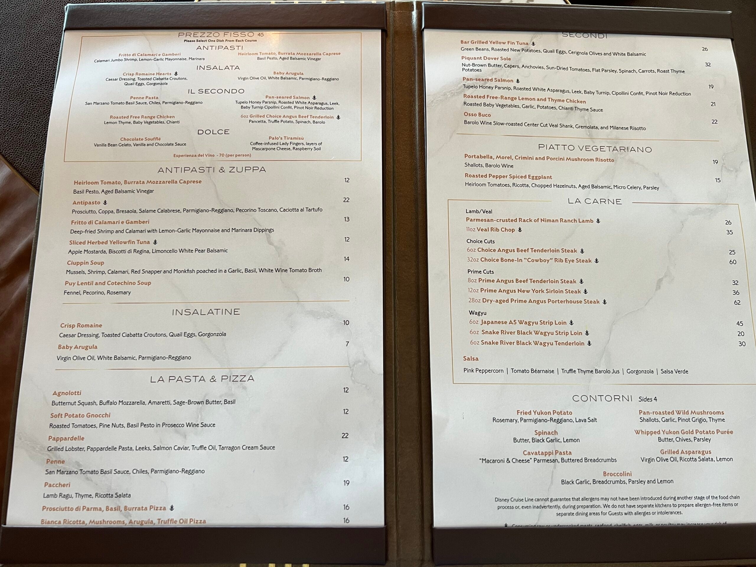 Expect a multi-course dinner at Palo to be close to a two-hour affair, which I'd say is an excellent use of your $50 (plus tip). Consider that a child's Bibbidi-Bobbidi Boutique hair, makeup and dress makeover costs $180-plus, most massages start close to $200, and an onboard beverage tasting is typically in the $40 to $50 range, and it's clear that dinner at Palo is a comparative steal by comparison.