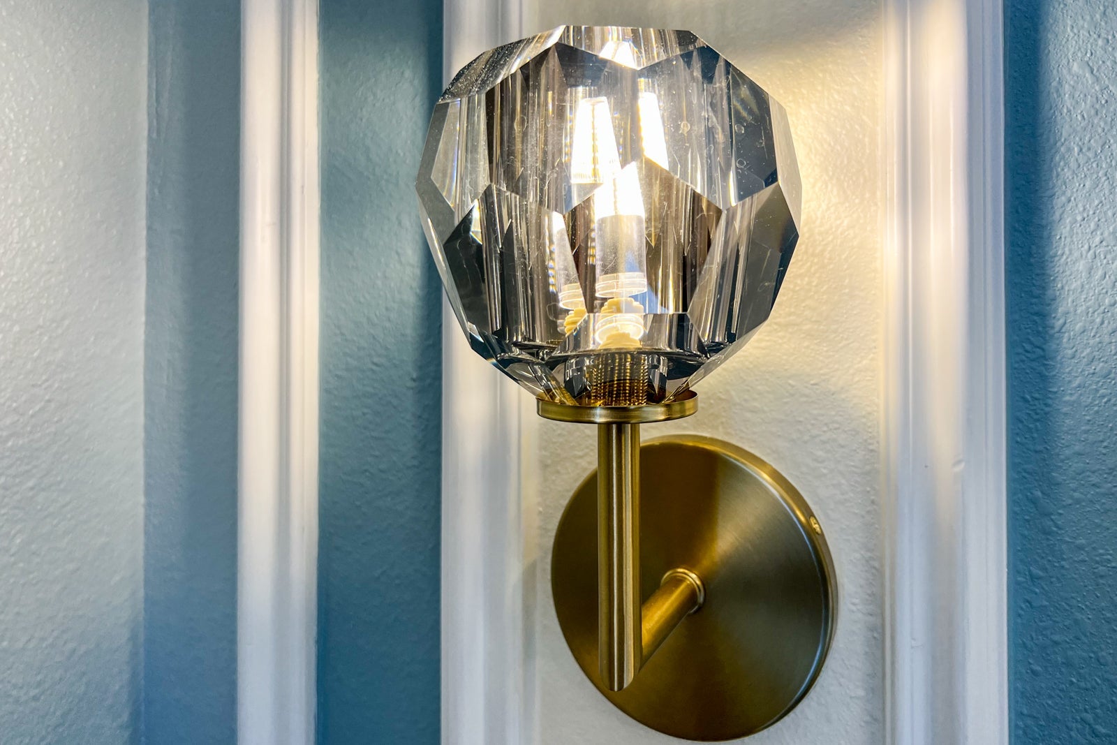My favorite touch in the room is unquestionably the chandelier flanked by some clear, glass birds.
