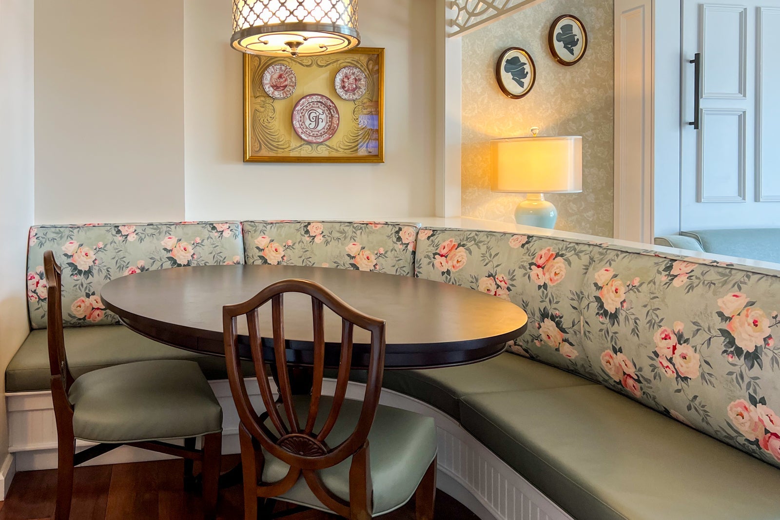 You'll find "Mary Poppins"-inspired touches throughout the room, which makes sense given that it's housed in the Victorian-styled resort. The touches are easy to spot but, if you aren't looking for them, they also blend into the color palette of golds, greens, blues and pinks set against the wood-tone flooring in an on-trend herringbone pattern.