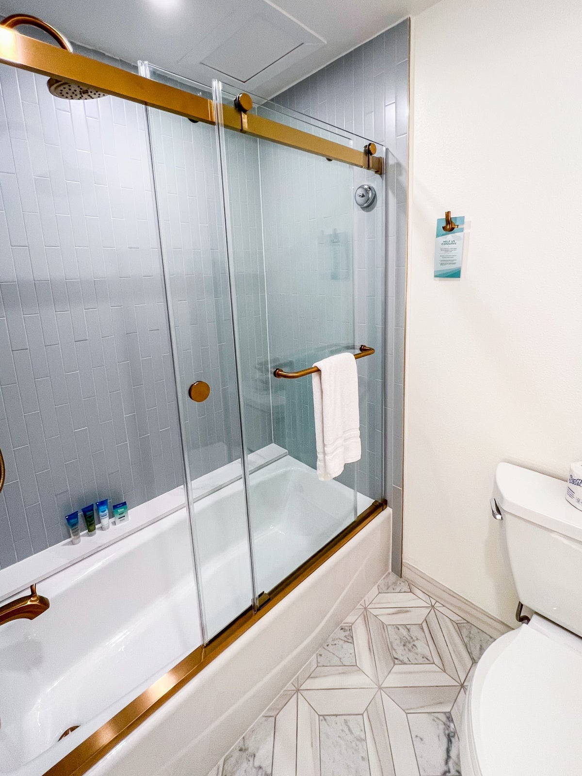 For prep and planning purposes, note that the tub and shower are in the same part of the bathroom in these room types.