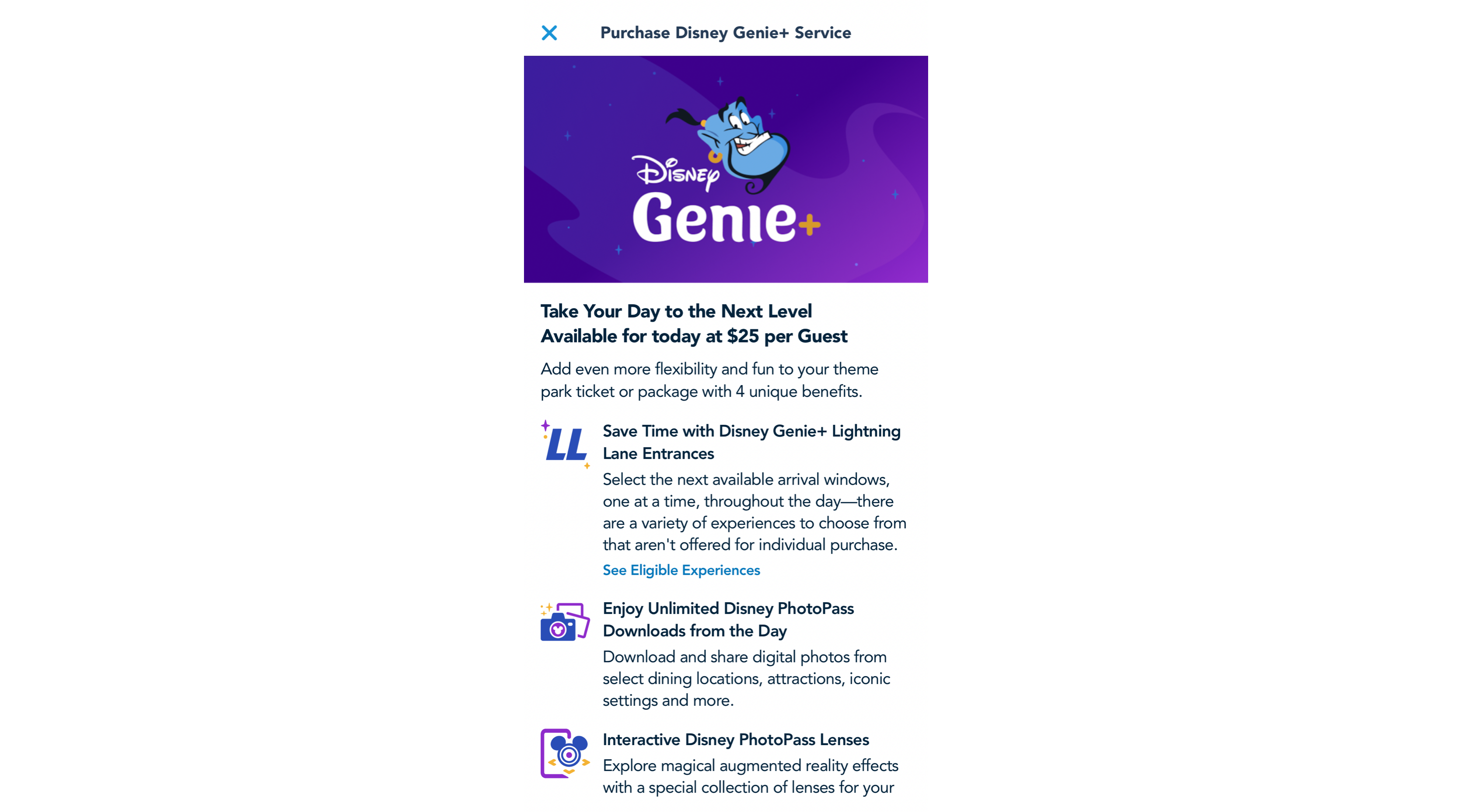 At Walt Disney World, prices for Genie+ and Lightning Lane access will vary by date, meaning the most popular days will be the most expensive. According to Disney blogger Scott Gustin, only pricing examples for October are currently available and are $15 on less-busy dates, and $22 on more-busy dates. Previously, it was a flat $15 on all dates at Disney World (and does not include PhotoPass access).