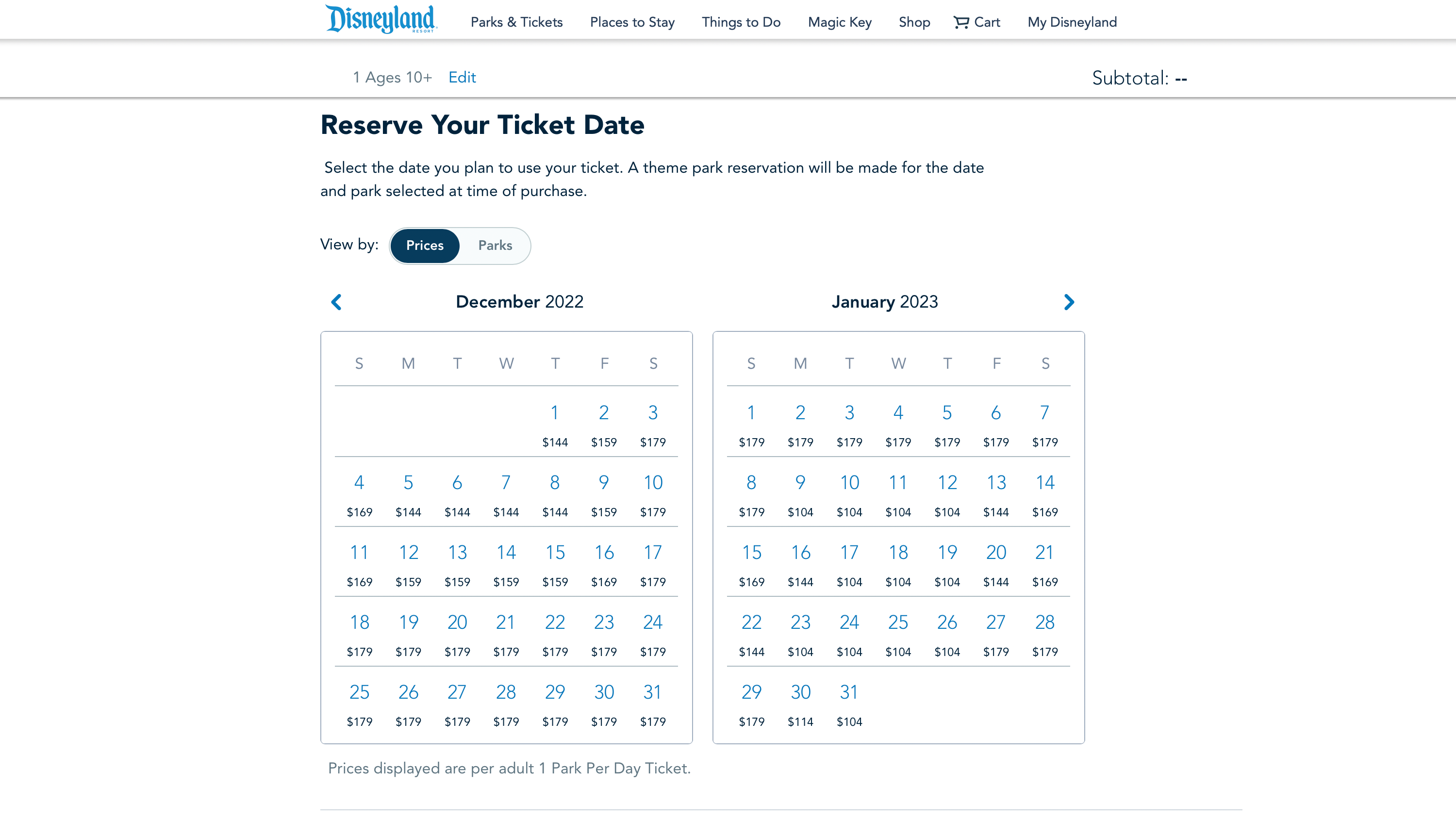 Here's a look at 1-day prices for 1 park with the pricing structure for Disneyland: