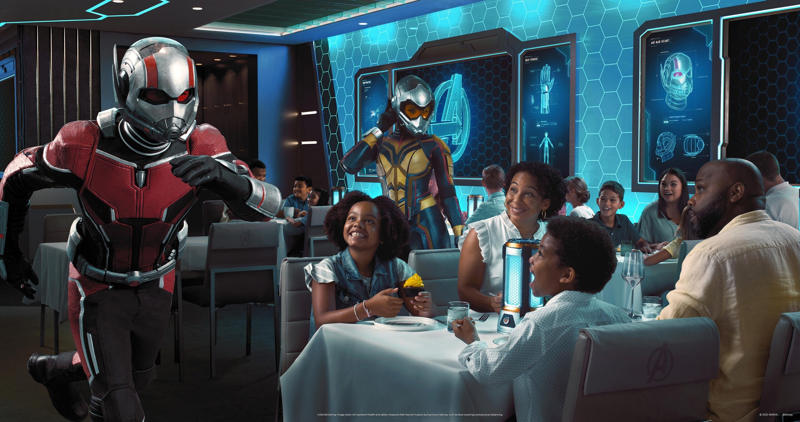 While dining in Worlds of Marvel, passengers will play an interactive role in an Avengers mission that features Ant-Man and The Wasp. According to Disney, the storyline will follow the two Marvel characters as they host a "special presentation of the most powerful Super Hero technologies, such as Captain America's shield, Iron Man's arc reactor and Ant-Man's Pym Particles, giving guests an up-close look at holographic models, field reports and iconic scenes from Marvel movies displayed on the screens surrounding the room."