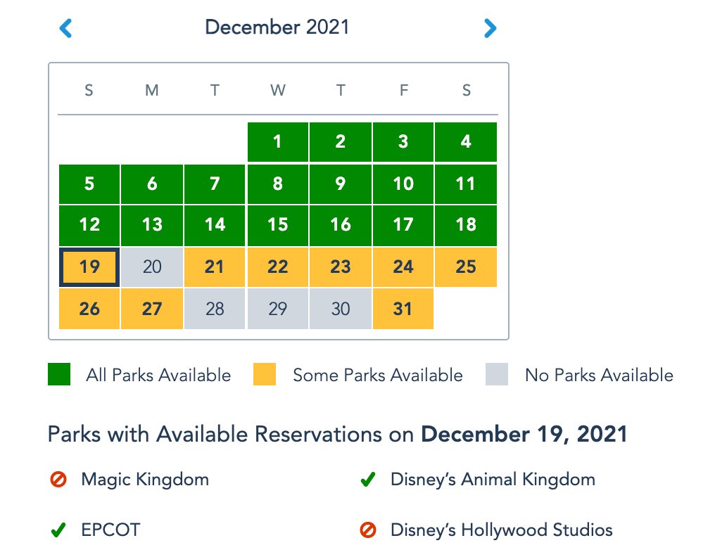 As the screenshot shows below, on Dec. 19 — a day that is currently available to book tickets — both Disney's Hollywood Studios and Magic Kingdom are unavailable for park pass reservations, though Epcot and Disney's Animal Kingdom are available. Note that for most of the days around and on Christmas, Magic Kingdom is not available at all.