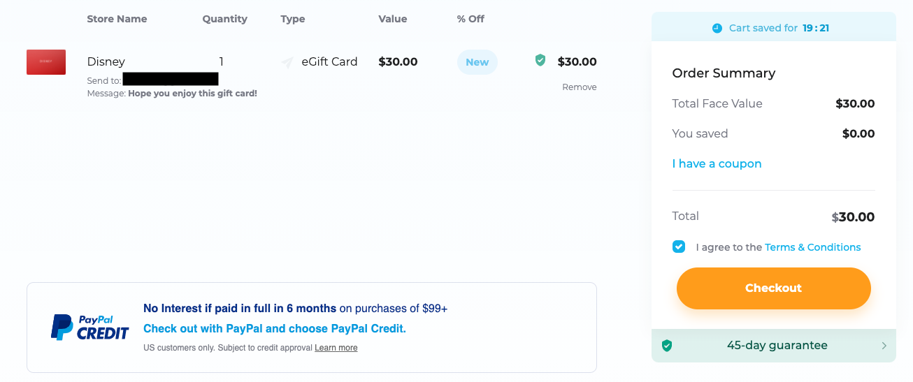While I typically buy discounted gift cards from the site, they also sell new gift cards for just about any amount, including brand-new Disney gift cards you can order for exactly $30.