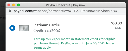 At the start of January 2021, American Express unveiled a new temporary perk for The Platinum Card® from American Express cardmembers: an up to $30 monthly PayPal statement credit. Amex has automatically issued these monthly statement credits for eligible PayPal purchases that I've charged each month.