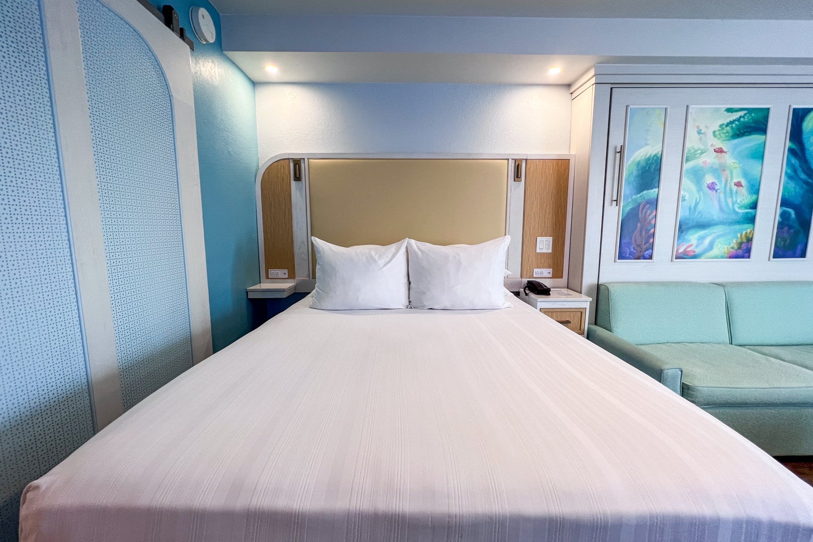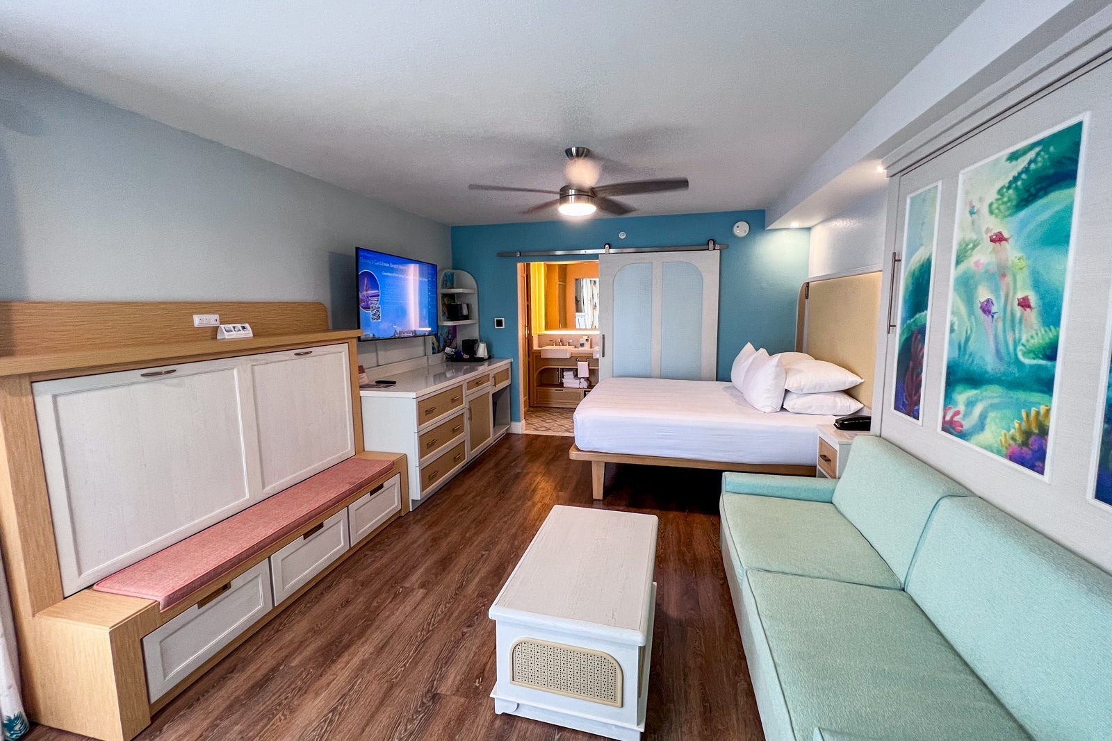 Over at the Caribbean Beach Resort, you'll find equally planned-out layouts in the recently renovated "Little Mermaid" rooms, where you can comfortably fit a family of five thanks to an extra pullout bed on top of the wall bed for two that tucks away during the day behind the couch.