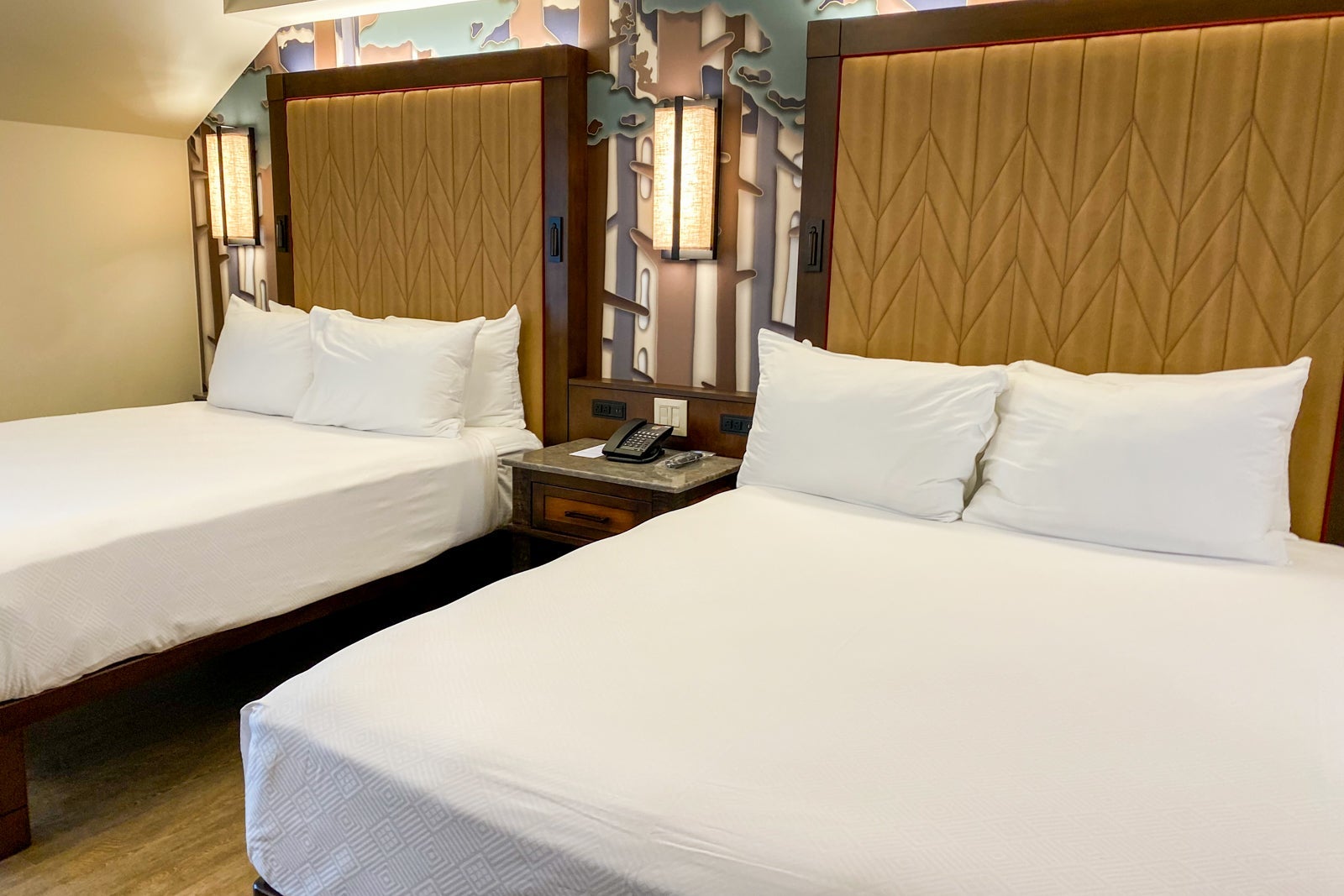 On the opposite side of the living area is a connecting bedroom with two queen beds that, while slightly toned down from the primary bedroom's decor, still has very distinct decor from the standard Wilderness Lodge bedroom.