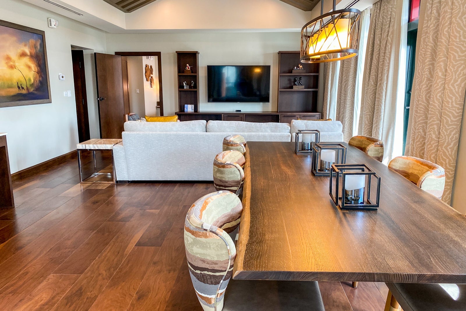 In addition to saying goodbye to the cowboy hats, gone are any saloon doors and peek-through wet bars. Now the Yosemite Suite has a massive, open living area comprised of an oversized sectional, dining table for six and a small kitchenette. (If you want a walk down memory lane, check out a 1994 video walk-through of the suite on YouTube.)