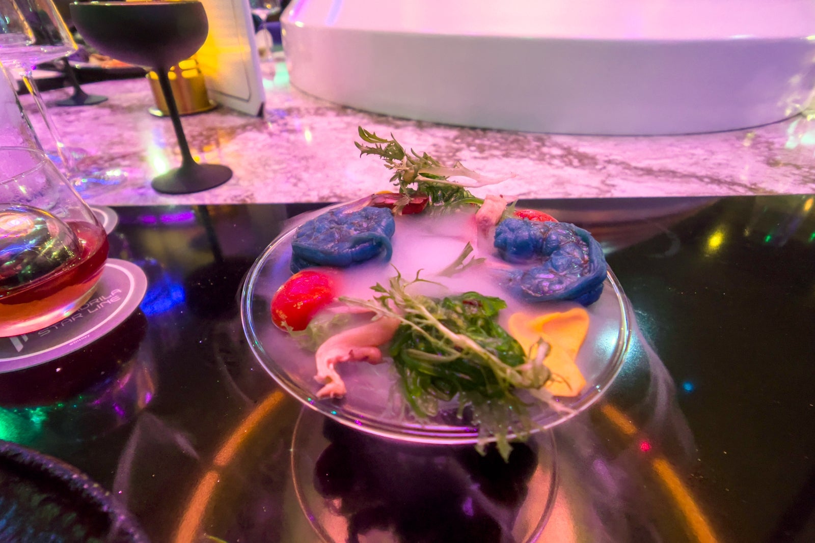 Another eye-catching dish was blue shrimp with seaweed and pickled mushroom served on a handblown plate from Spain.