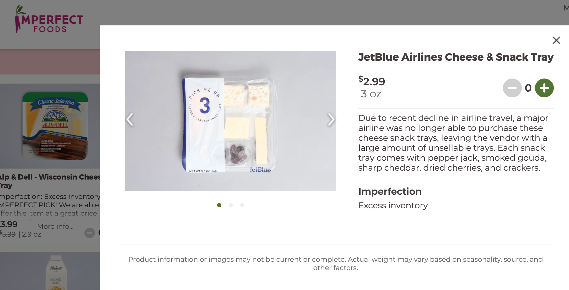 One current grocery option is an individually-sized JetBlue cheese and snack tray of pepper jack, smoked Gouda, sharp cheddar, dried cherries and crackers. As first spotted by TPG's Laura Motta, these snack packs are $2.99 apiece and can be added on to an existing Imperfect Foods grocery order.