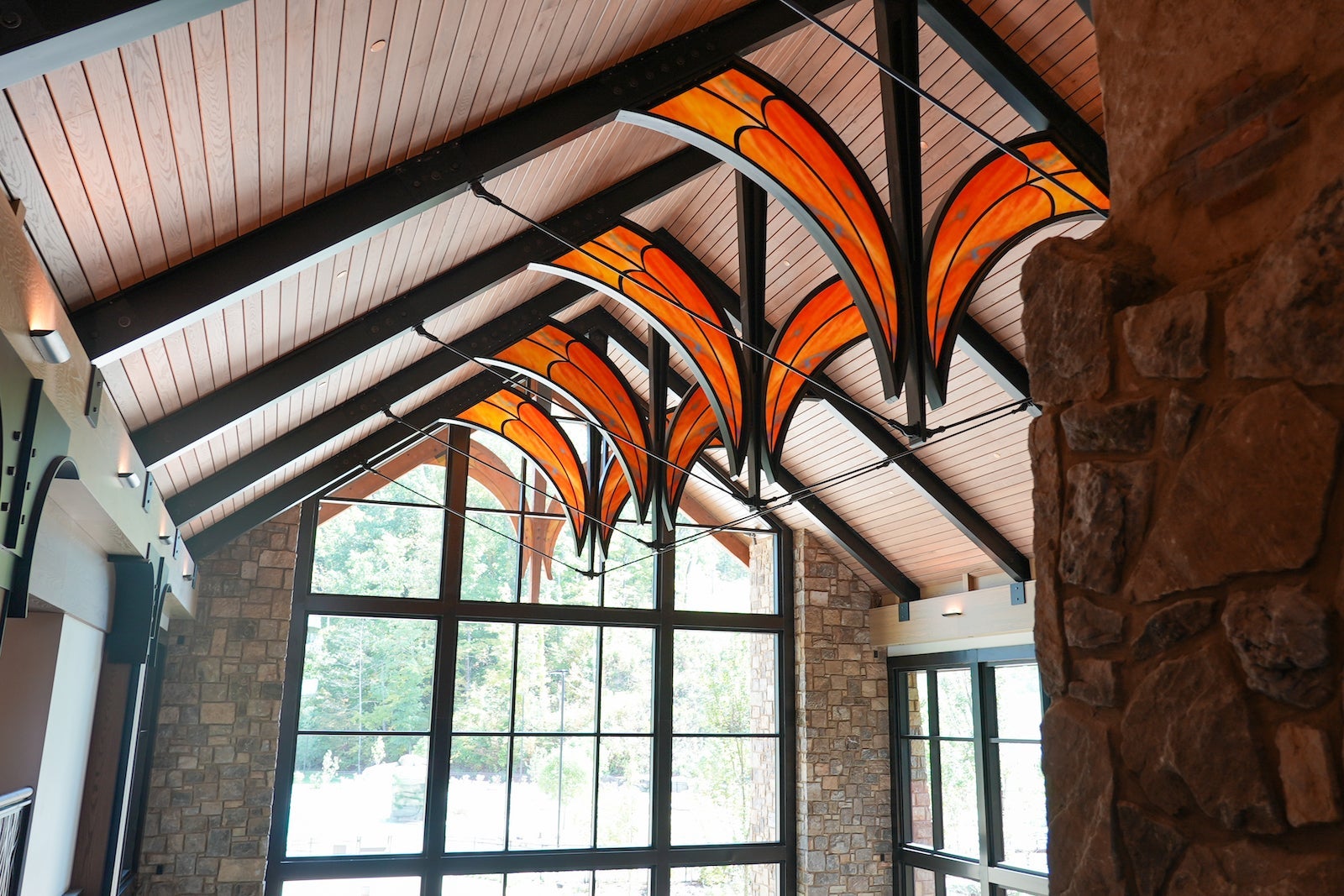 Upon entering, guests are greeted with a larger-than-life portrait of Parton, a check-in desk with a screen showing scenes of wildlife and nature throughout the seasons in the Smokies and a seating area with a large fireplace, vaulted ceilings with subtle butterfly motifs (Parton's favorite) and an overwhelming sense of home.