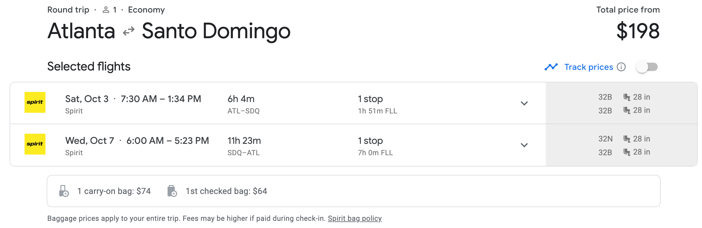 On Spirit between Atlanta (ATL) and Santo Domingo (SDQ) in early October: