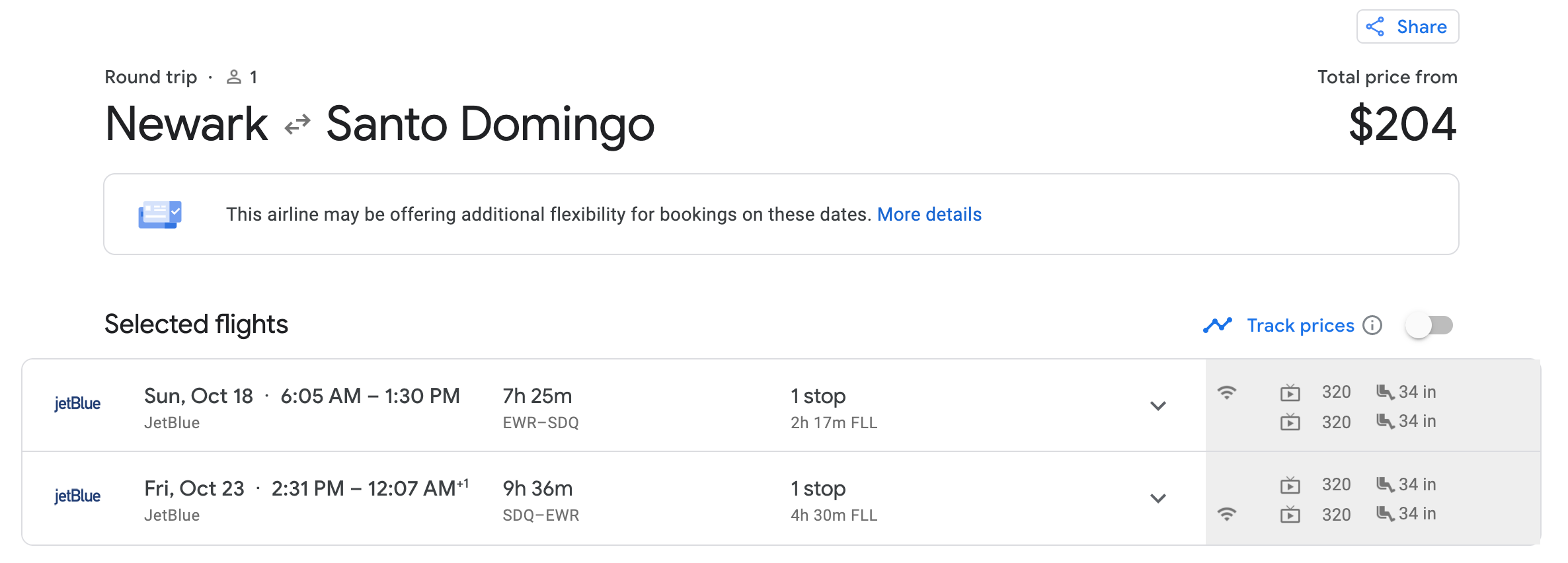 On JetBlue between Newark (EWR) and Santo Domingo (SDQ) in mid-October: