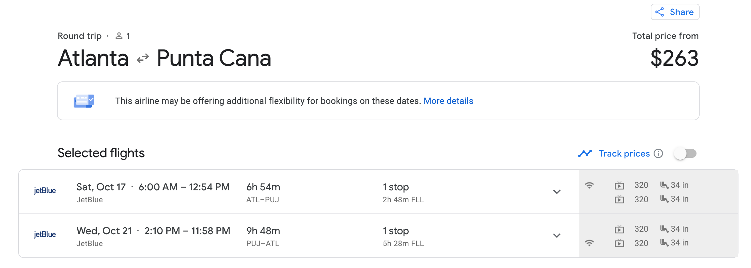 To Punta Cana (PUJ) from Atlanta (ATL) from $263 round trip on JetBlue: