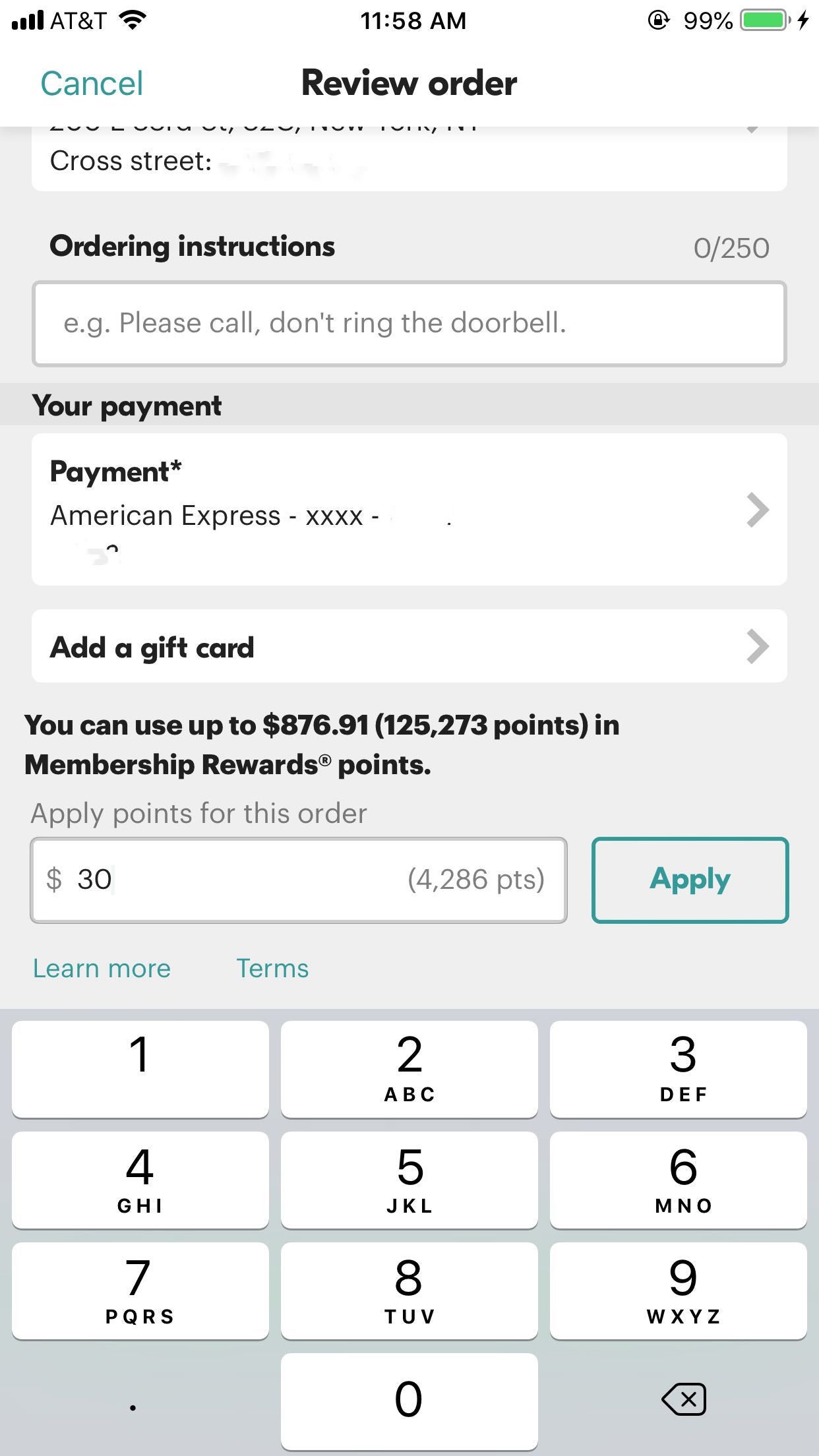 Let's do a little real-world example. Say I'm ordering sushi for dinner tonight because I can't be bothered to cook. My total comes out to about $30 (What? Naruto rolls are expensive, ok?). When I go to checkout on Seamless, I'm prompted to use some of my Amex points, also known as Membership Rewards points.