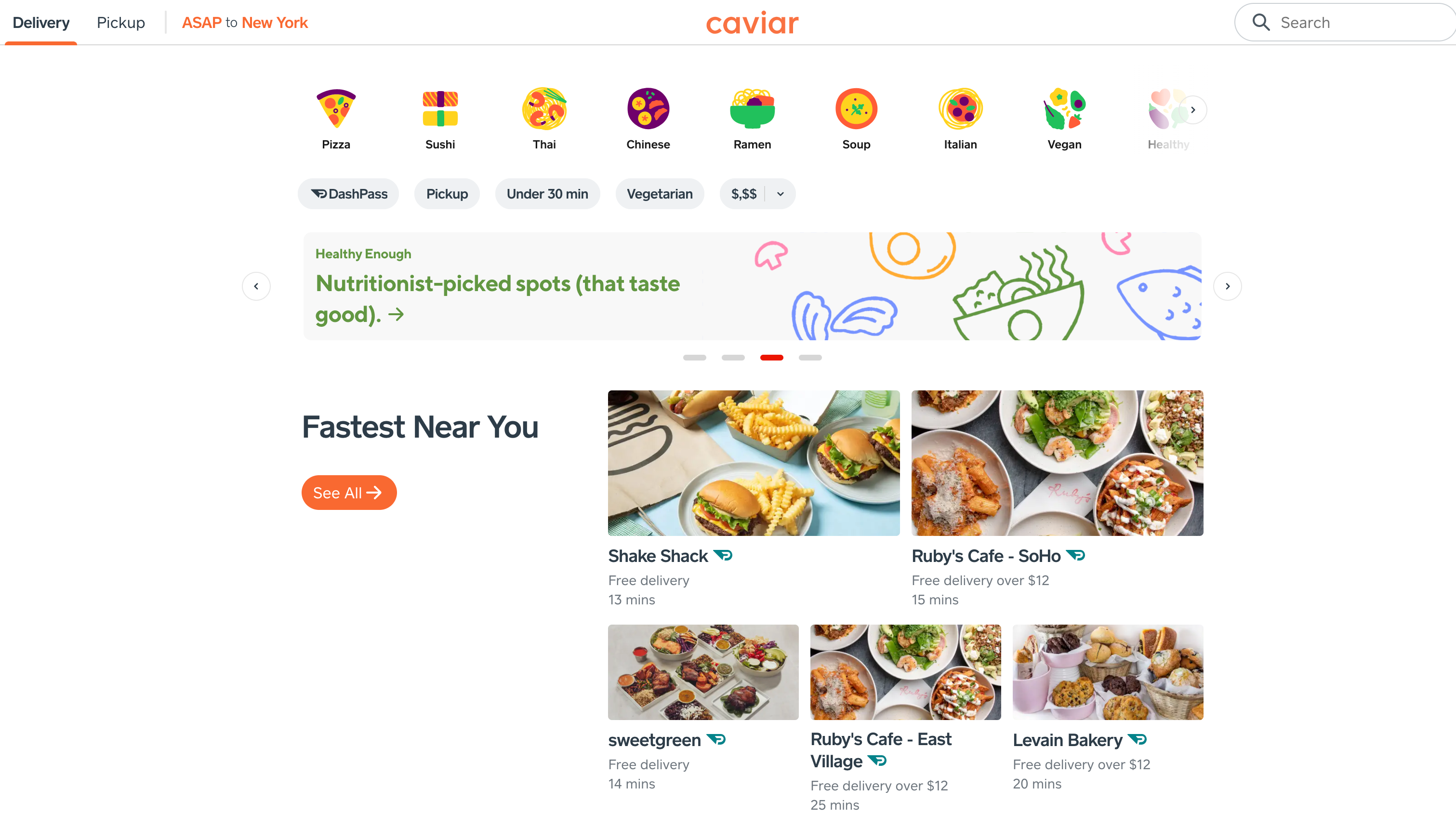 For those unacquainted with Caviar, the food ordering service is essentially the same as DoorDash but features more independent and local restaurant selections in 28 major cities across the U.S. It stands out by offering many "only on Caviar" exclusive restaurants and unique food categories like, "Women-Powered" and "Healthy Enough" (the latter is vetted by nutritionists).
