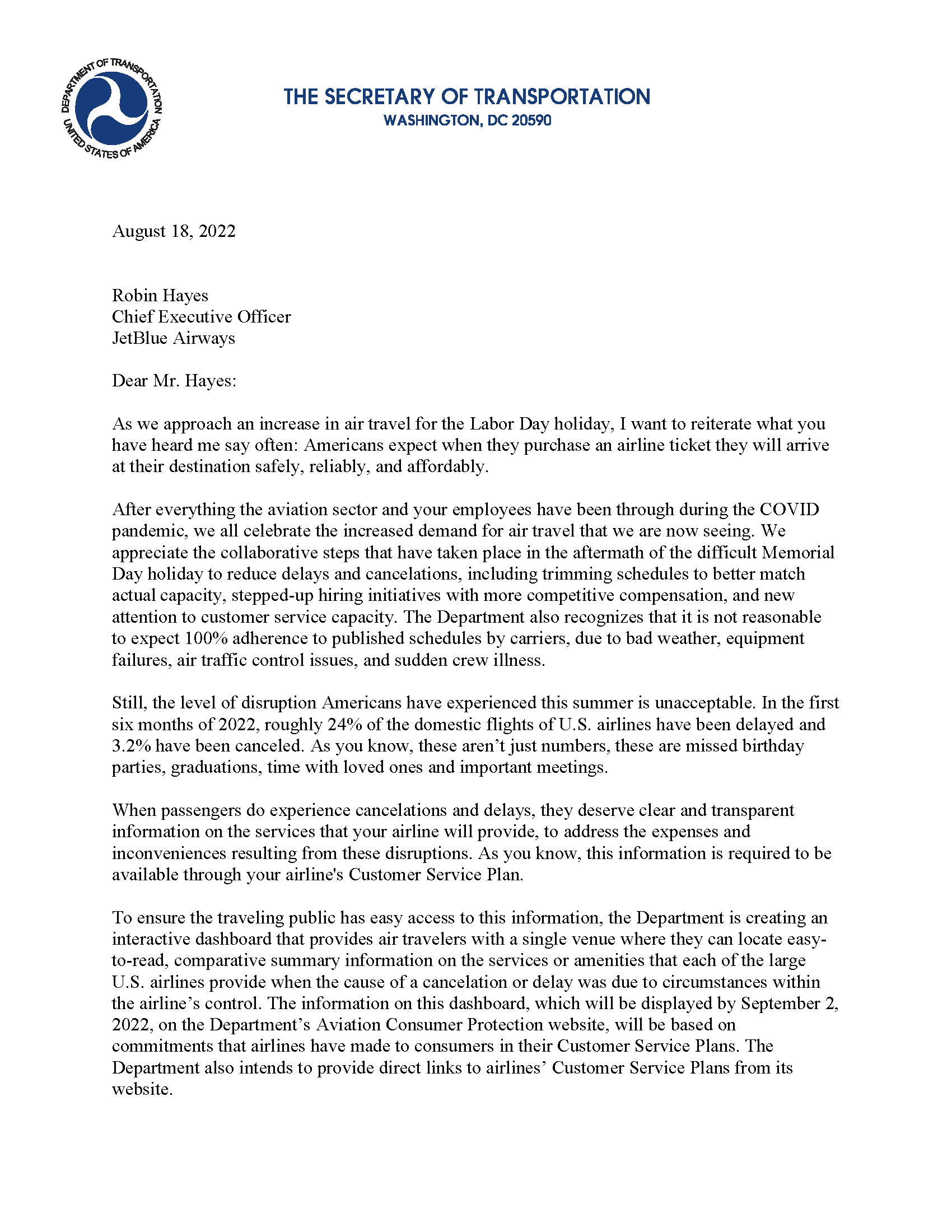 "The level of disruption Americans have experienced this summer is unacceptable," Buttigieg wrote in the letter. "In the first six months of 2022, roughly 24% of the domestic flights of U.S. airlines have been delayed and 3.2% have been canceled. As you know, these aren't just numbers, these are missed birthday parties, graduations, time with loved ones and important meetings."