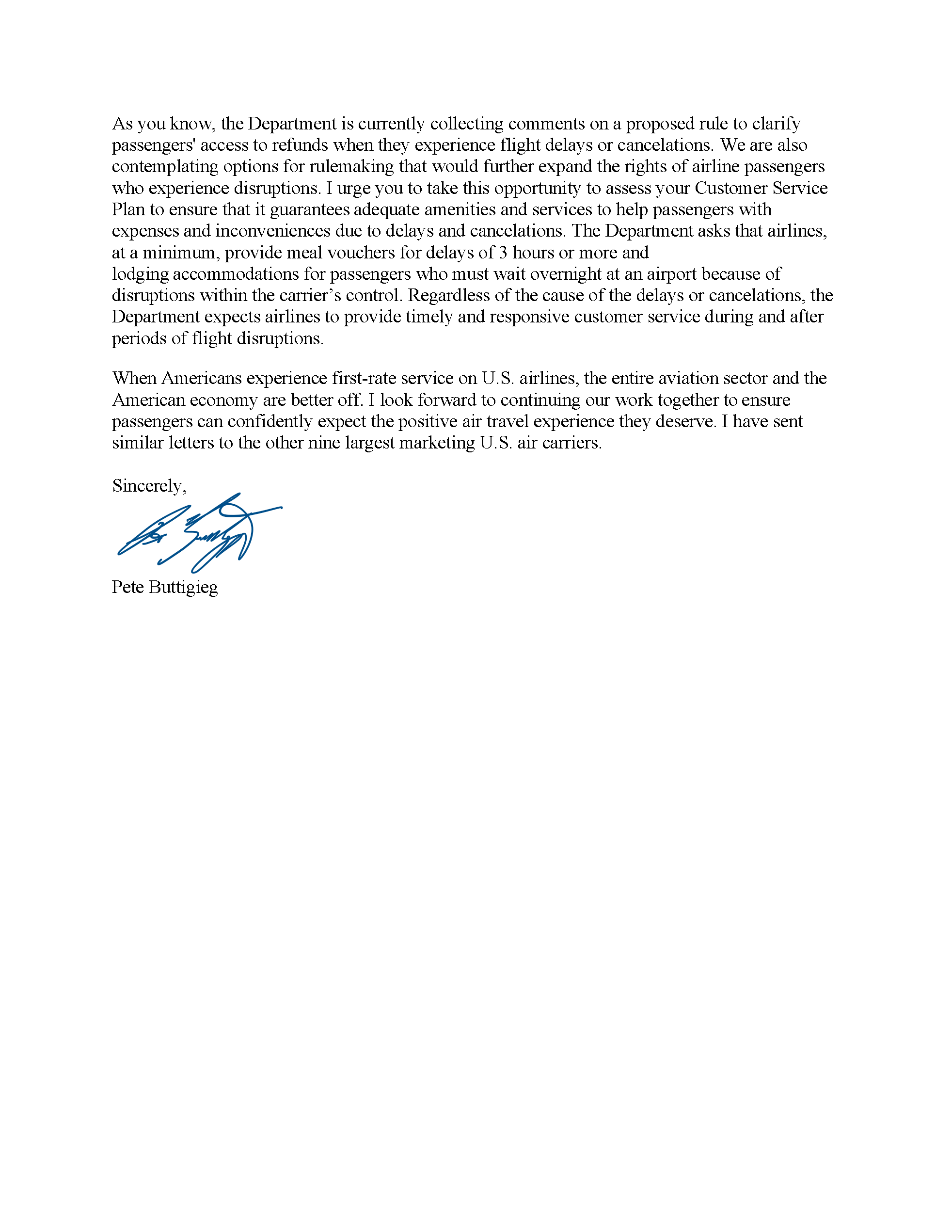 In the letters, one of which was shared with TPG, Buttigieg also implored airlines to provide meal vouchers for delays of three hours or more and hotel accommodations for overnight disruptions. He also said that the department is exploring possible regulatory action "that would further expand the rights of airline passengers who experience disruptions."