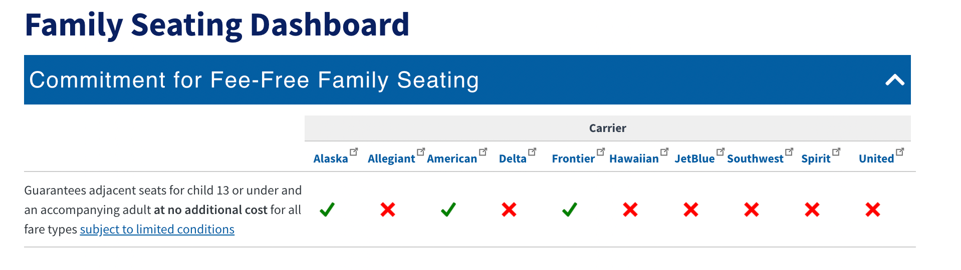 Now, families can use the dashboard to see which airlines ensure family seating without a fee for children who are 13 years old or younger, with green checks denoting that the airline does meet the DOT requirements. Currently, the majority of U.S. airlines on the dashboard have a red "X," meaning they do not meet the requirements.