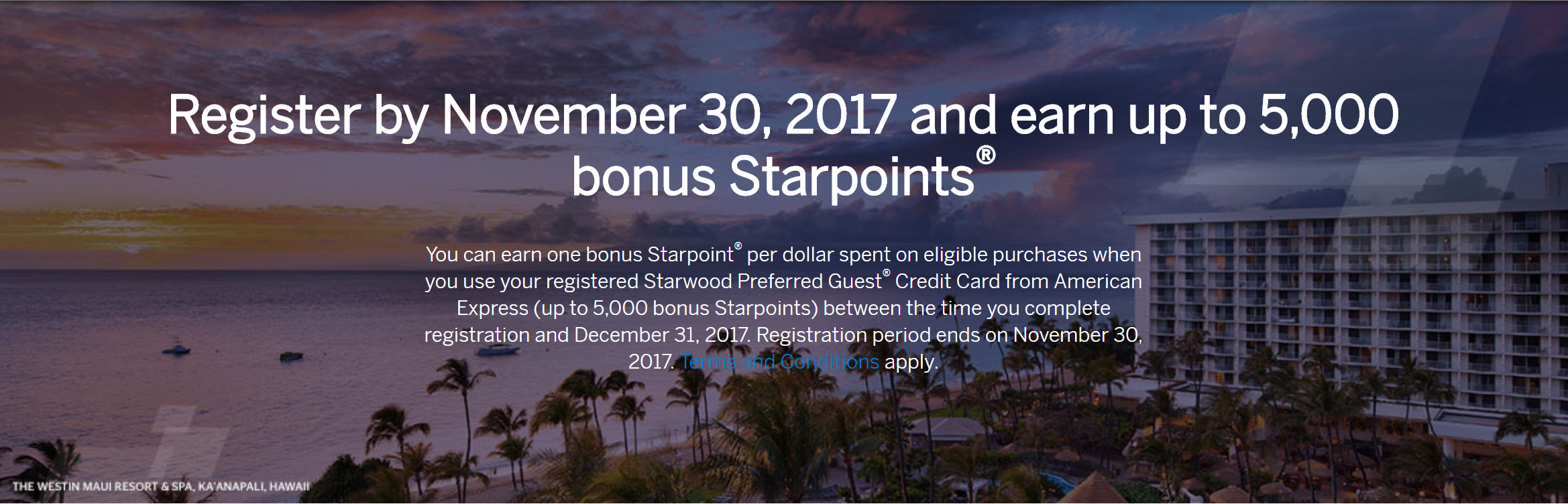 Already one of TPG's best credit cards for everyday spending, the Starwood Preferred Guest Credit Card from American Express just got a lot more rewarding for those targeted by this new promotion. Check here to see if you're targeted to earn a bonus Starpoint for every dollar spent between registration and December 31, 2017. You can earn up to 5,000 bonus Starpoints through this promotion.
