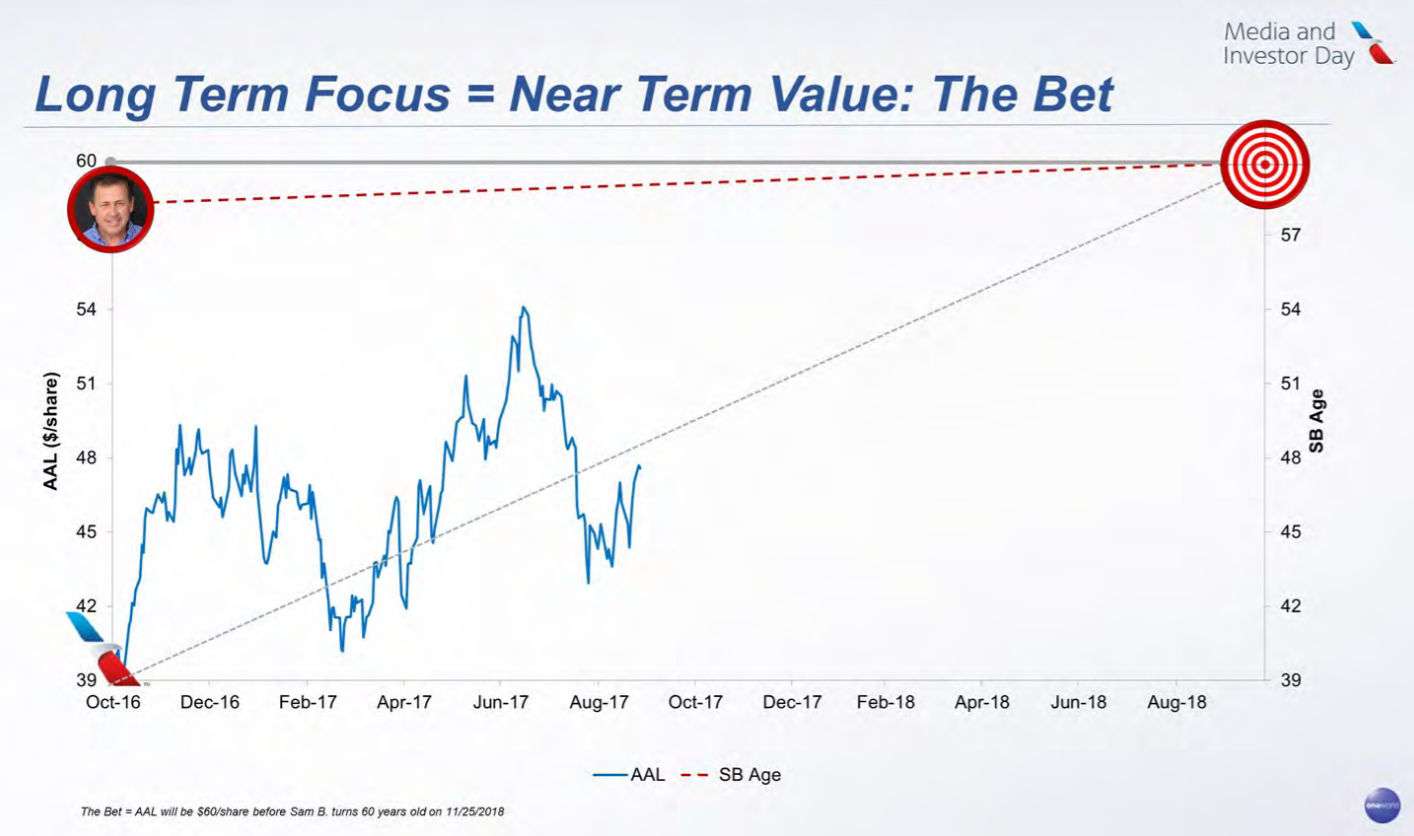 In September 2017, American Airlines CEO Doug Parker took to the stage of the airline's "Media and Investor Day" (the first in more than five years) to announce a bet he'd made with a UBS stock analyst back in October 2016: Before the analyst turned 60 years old in November 2018, American Airlines' stock (ticker: AAL) would hit $60 per share. The wager: a bottle of wine.